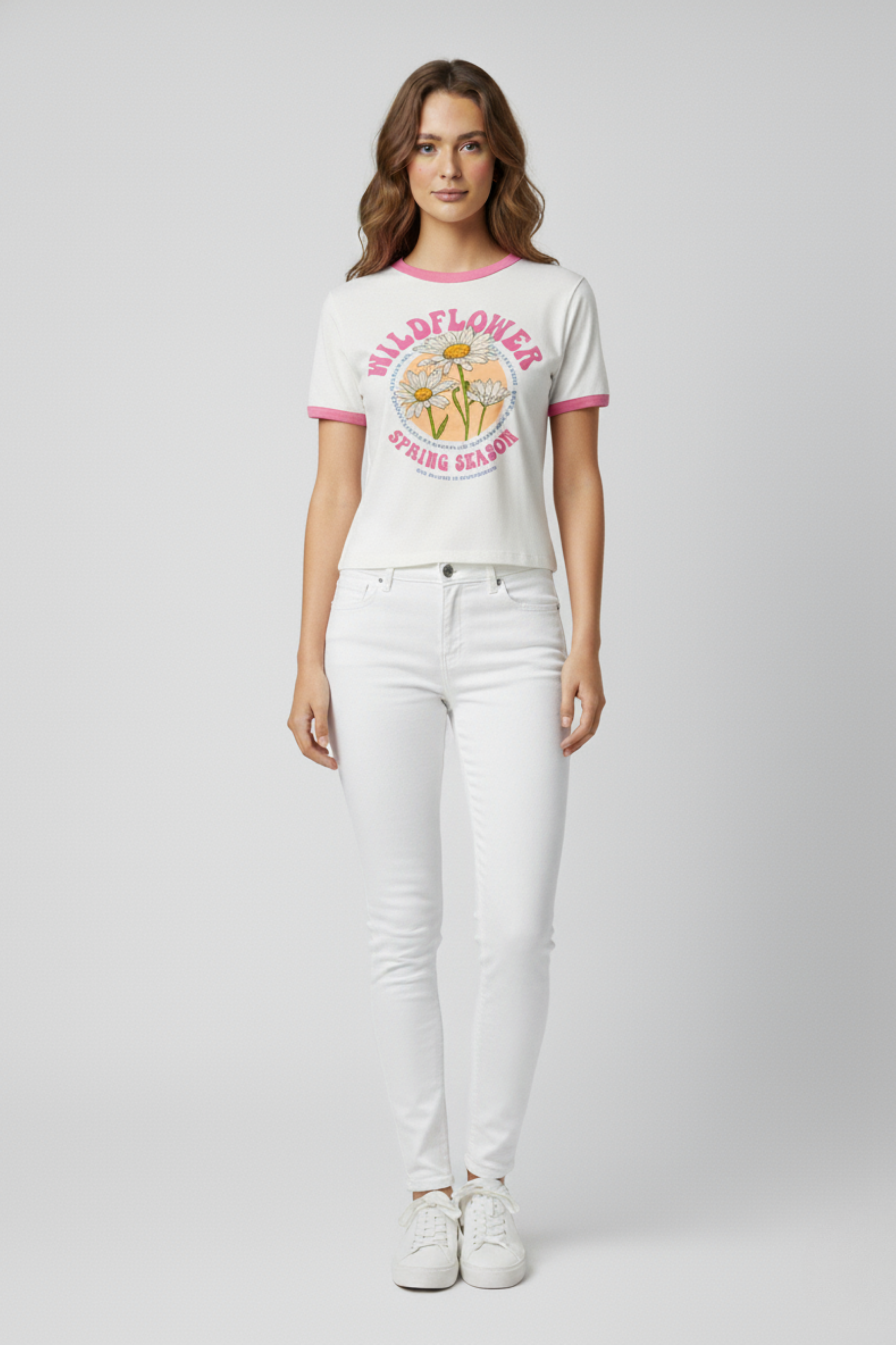 Renkli detaylarıyla enerjik bir görünüm sunan Beyaz Çiçek Baskılı Pembe Ribana Detaylı Kadın Tişört, yumuşak dokusu ve rahat kalıbıyla günlük kombinlerin favorisi olacak. Yaka ve kol uçlarındaki pembe ribana detayı, tişörte genç ve dinamik bir hava katarken, çiçek baskısı bahar enerjisini yansıtıyor. Jean, şort veya eteklerle kolayca kombinlenebilen bu tişört, hem konforlu hem de trend bir görünüm arayanlar için ideal.