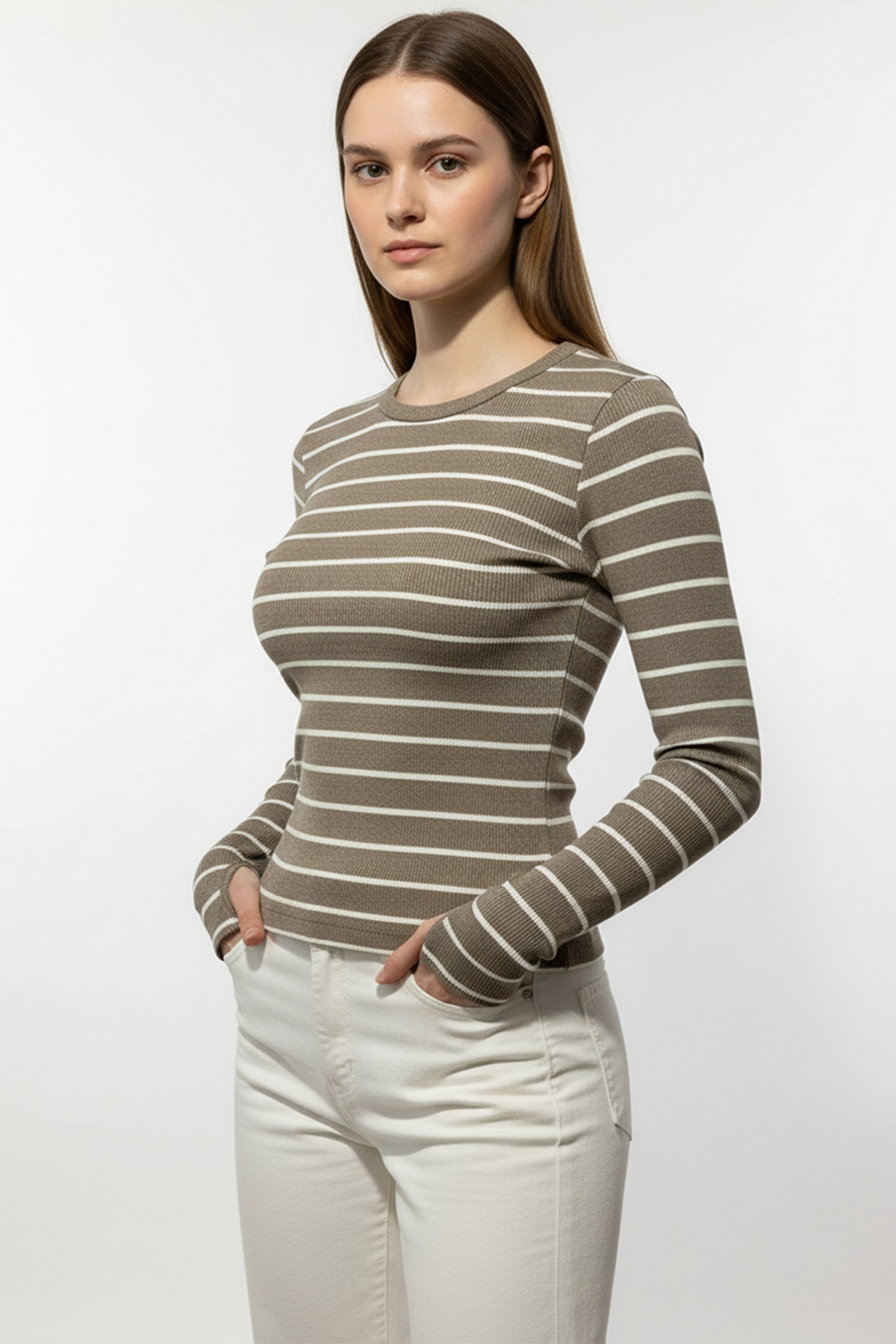 Modern tarzı ve özgün detaylarıyla öne çıkan Kadın Çizgili Parmak Geçmeli Bluz - Kahverengi, hem rahat hem de şık bir görünüm sunar. Esnek ve yumuşak kumaş dokusu sayesinde gün boyu konfor sağlarken, parmak geçmeli kol detayı ile trend bir duruş kazandırır.