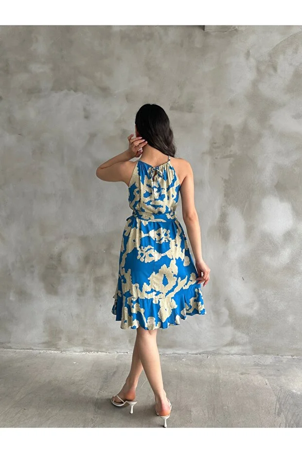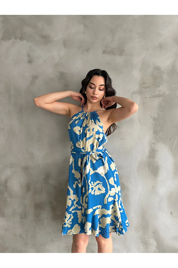 Kadın Mavi Bej Desenli Halter Yaka Kuşaklı Yazlık Elbise