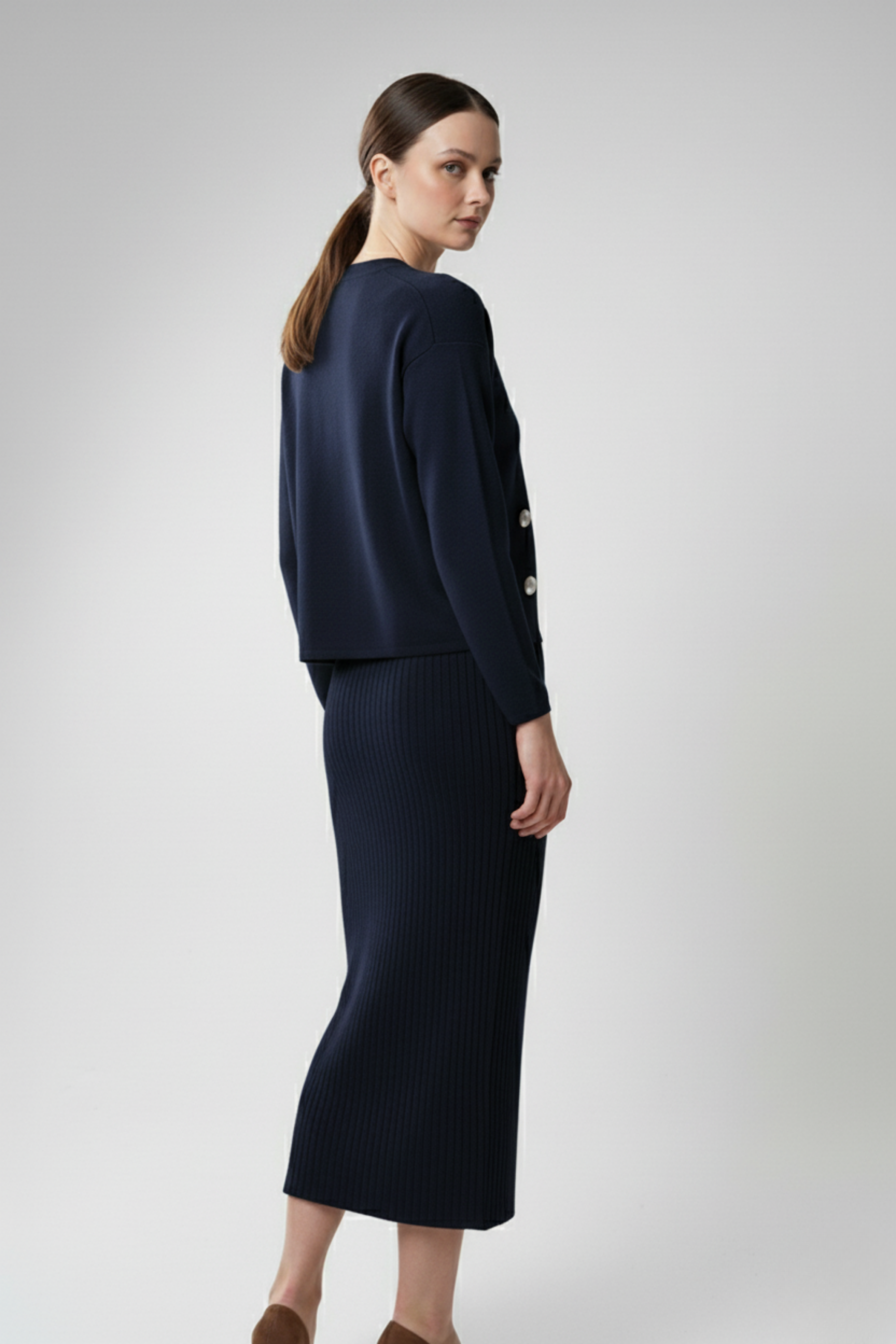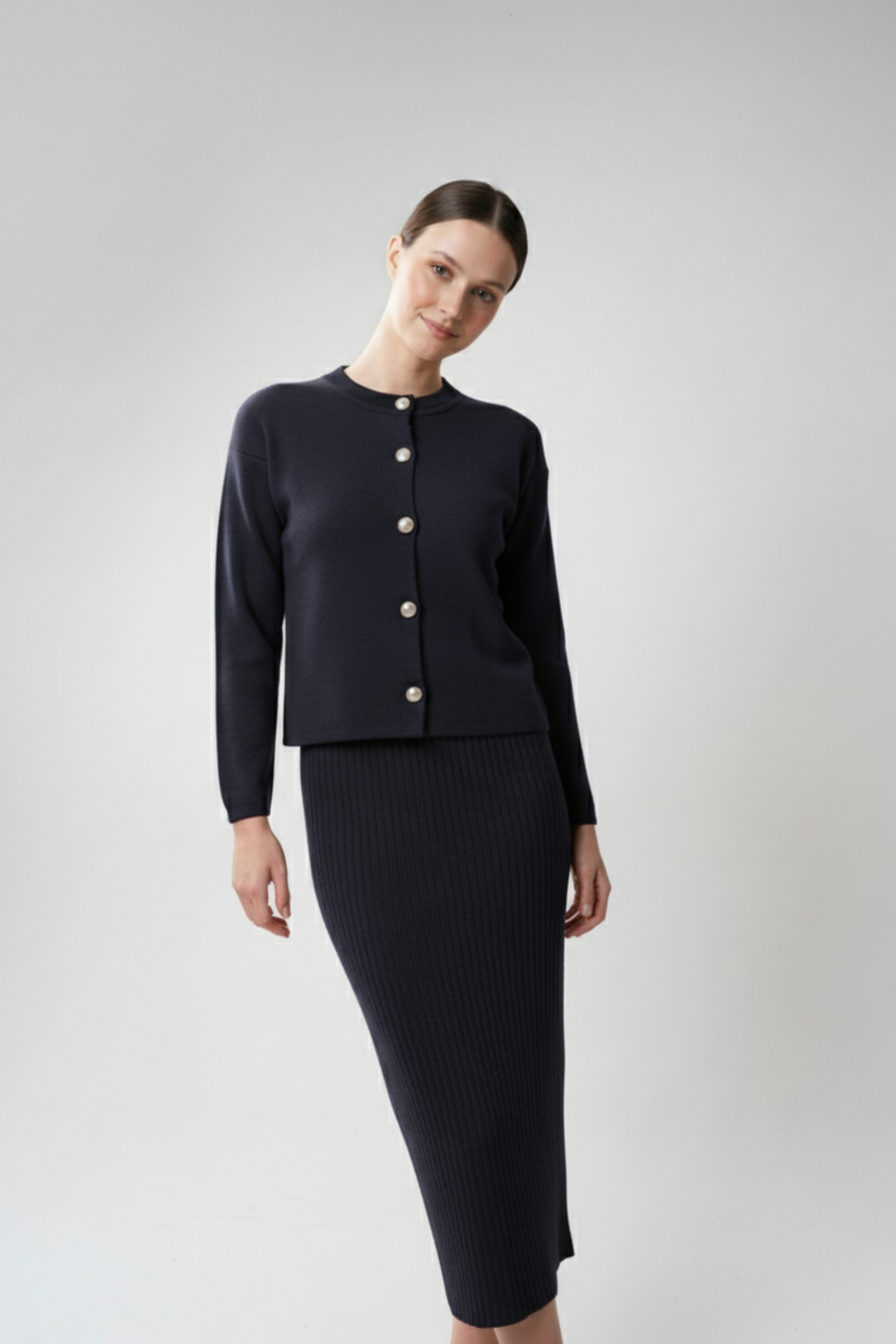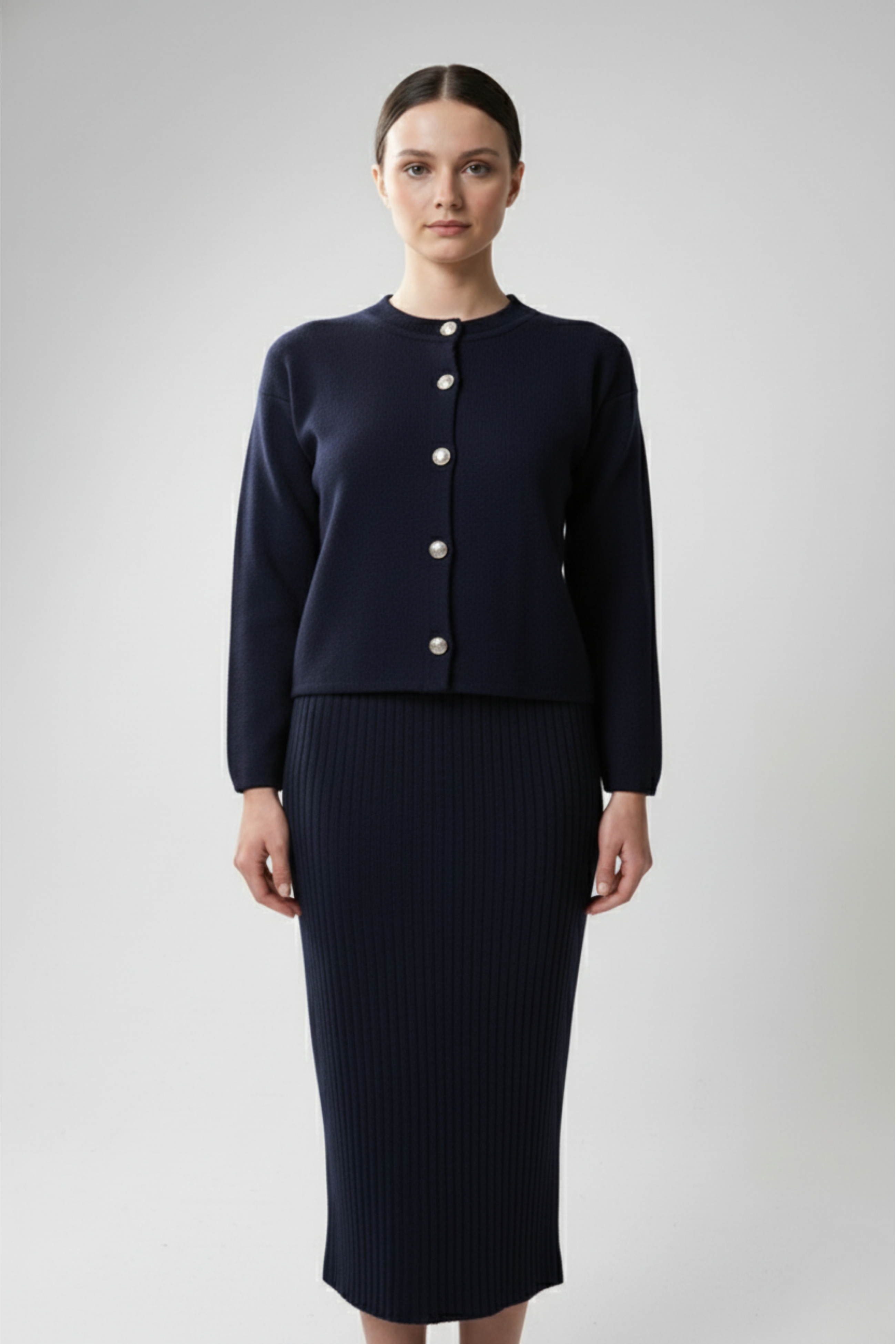 Kadın Hırka Elbise İkili Takım - Lacivert, zarafeti ve asaleti bir araya getiren klasik ama iddialı bir görünüm sunuyor. Lacivert rengin güçlü ve sofistike havası, her stile uyum sağlarken, triko dokusu konforu ve şıklığı aynı anda sunar. Uzun hırka ve uyumlu elbise kombinasyonu, tek parçada bütün bir şıklık oluşturur. Günlük hayatta zarif bir duruş ya da akşam buluşmalarında sade bir şıklık arayan kadınlar için kusursuz bir tercih!