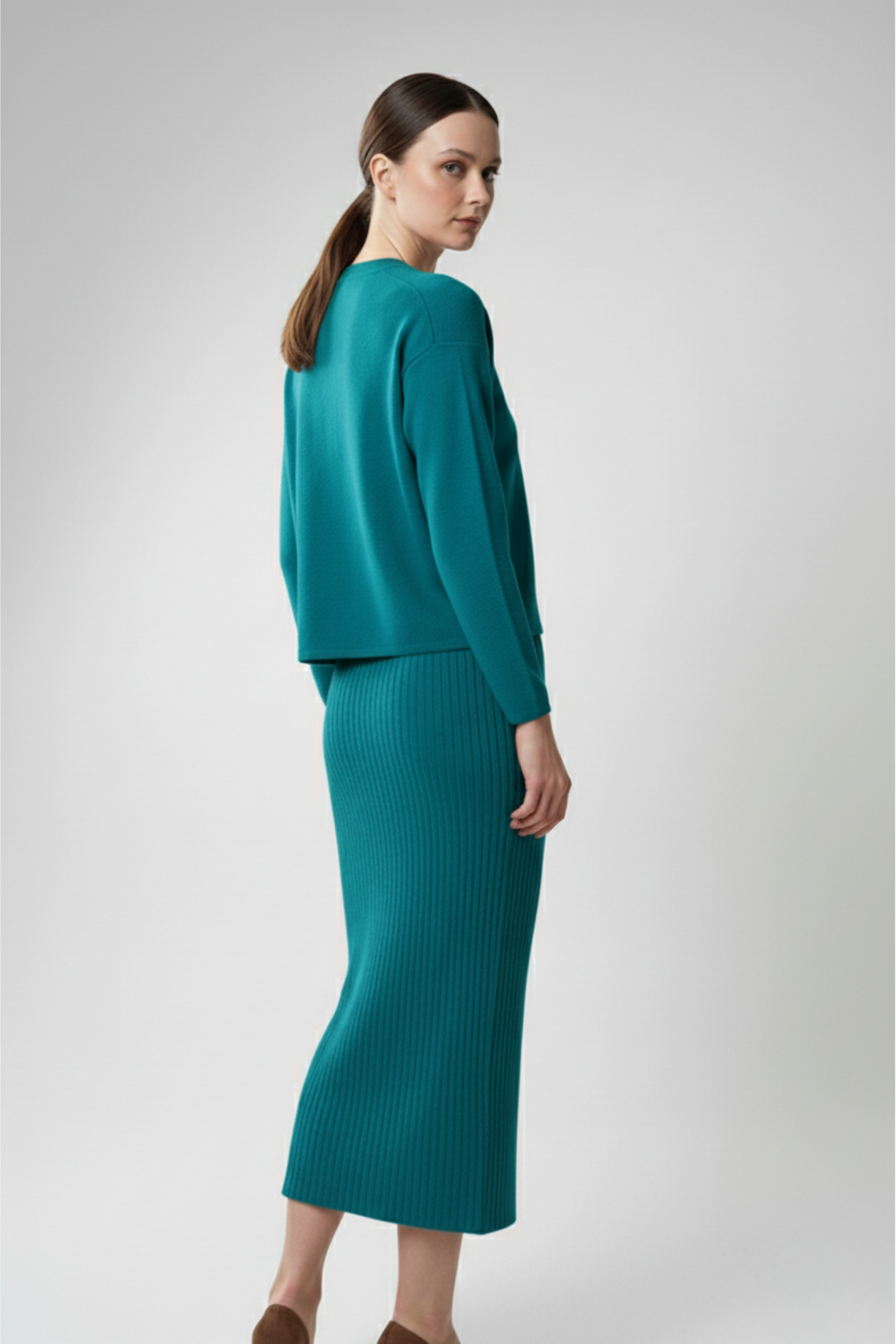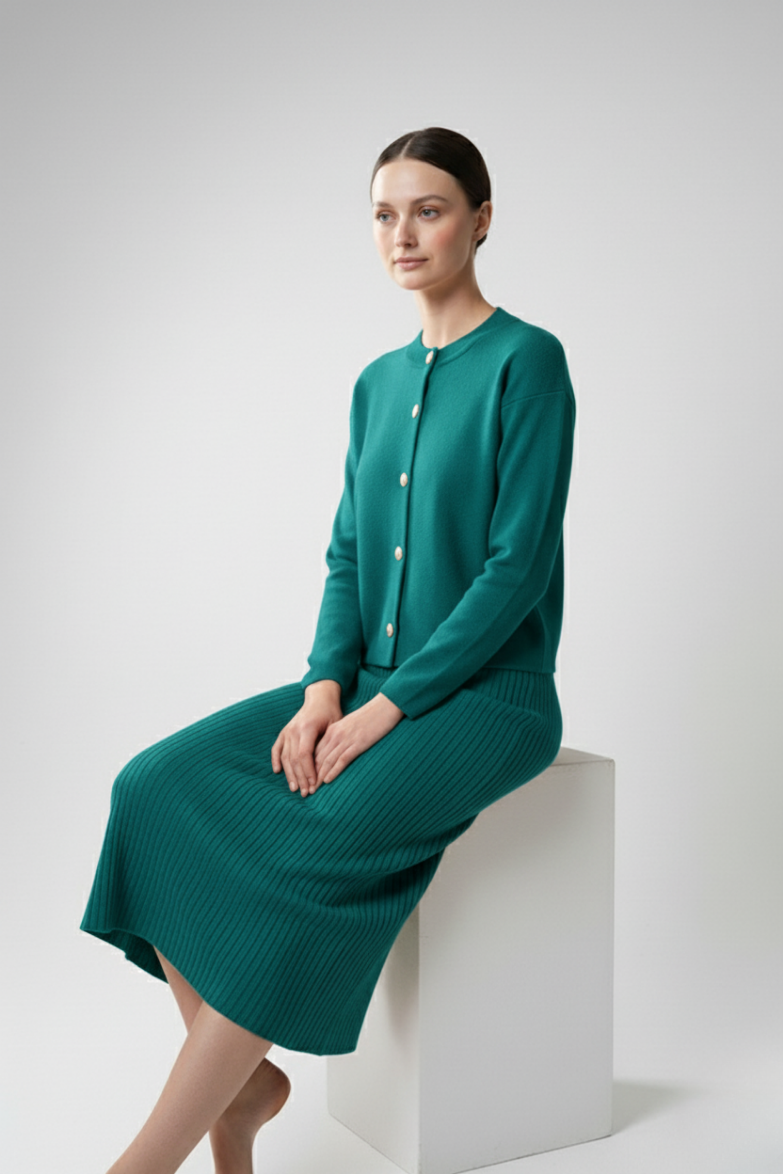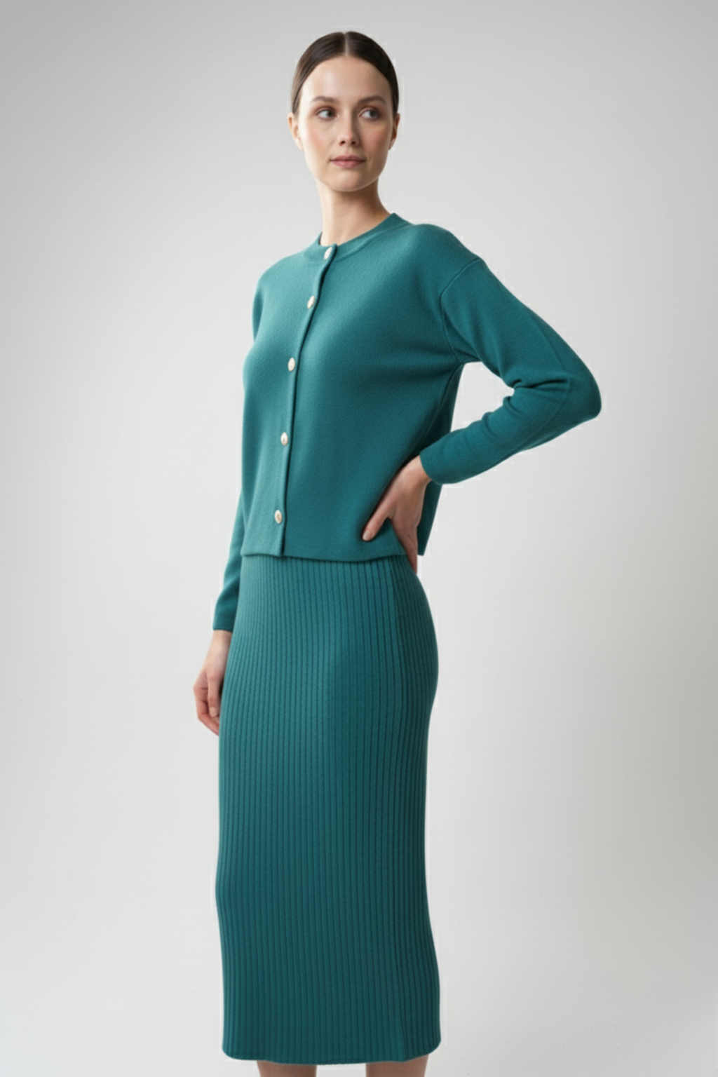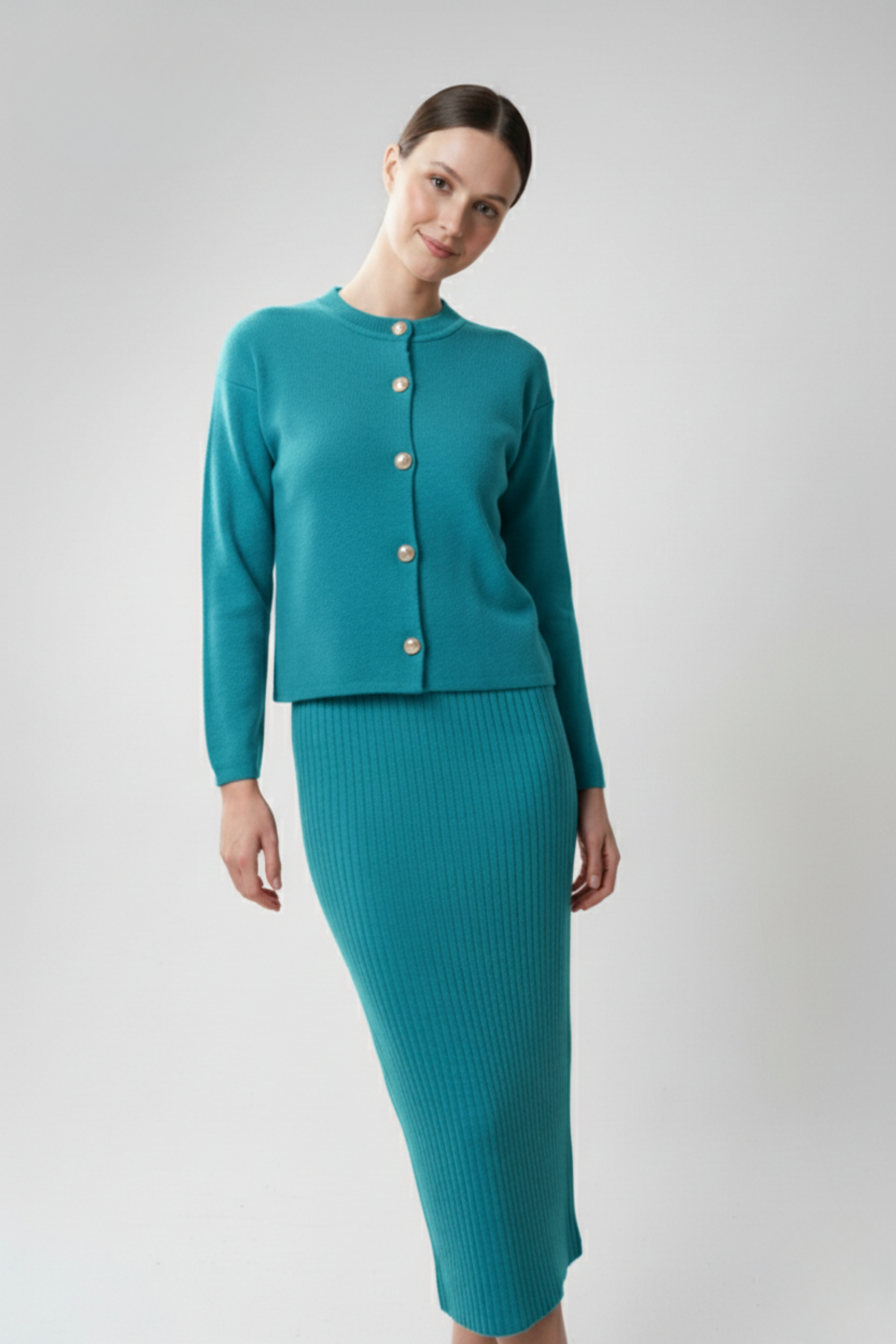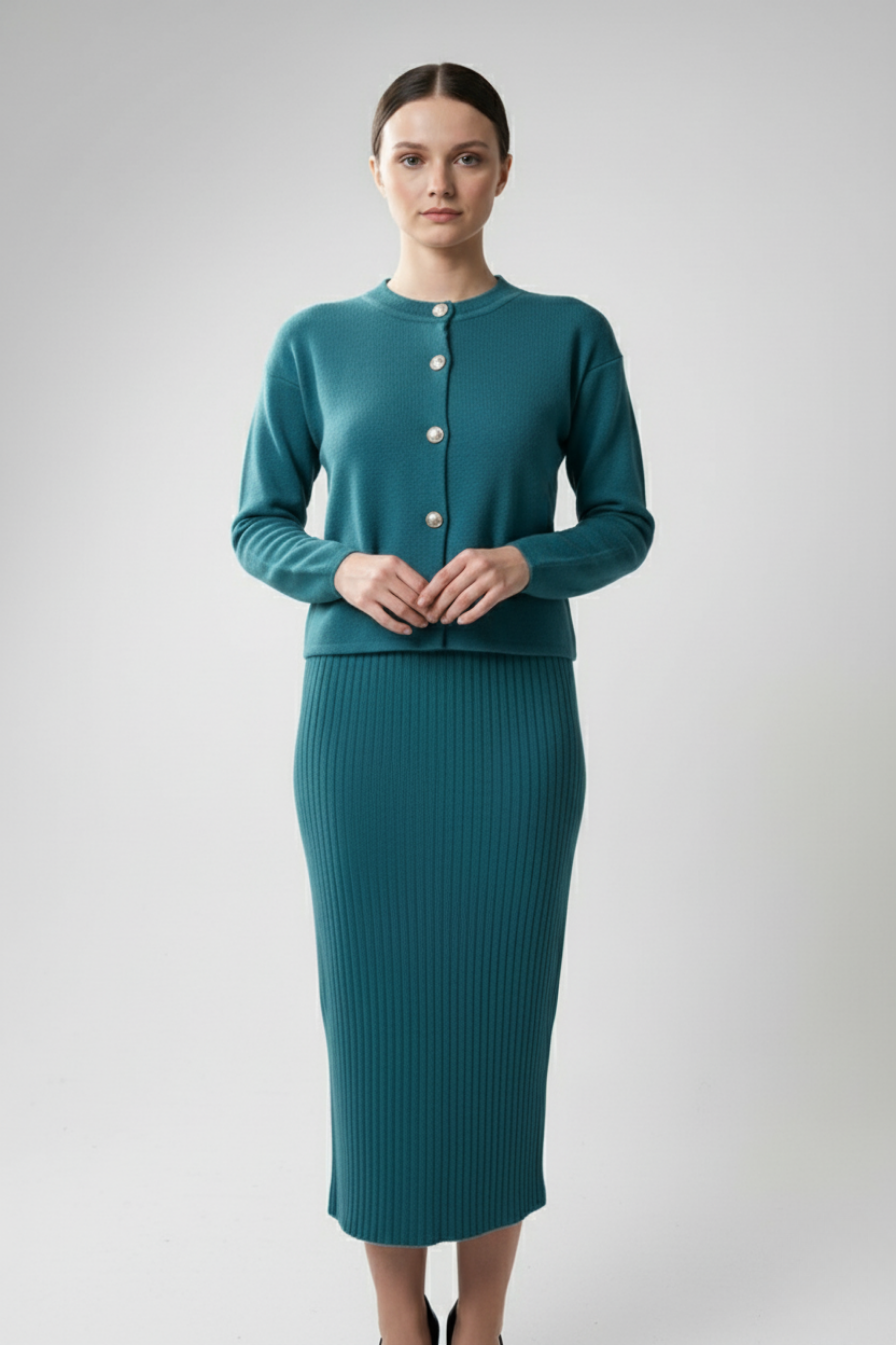 Kadın Hırka Elbise İkili Takım - Turkuaz, enerjik rengi ve zarif duruşuyla tarzına canlılık katmak isteyen kadınlar için tasarlandı. Turkuazın ferah ve dikkat çekici tonu, sade tasarımı modern bir şıklığa dönüştürürken, triko dokusu yumuşaklığı ve konforu bir arada sunar. Uzun hırka ve uyumlu elbise detayı, şık bir bütünlük oluşturarak gün boyu zarif bir görünüm sağlar. Hem günlük kullanımlarda hem de özel davetlerde fark yaratmak için ideal bir takım!