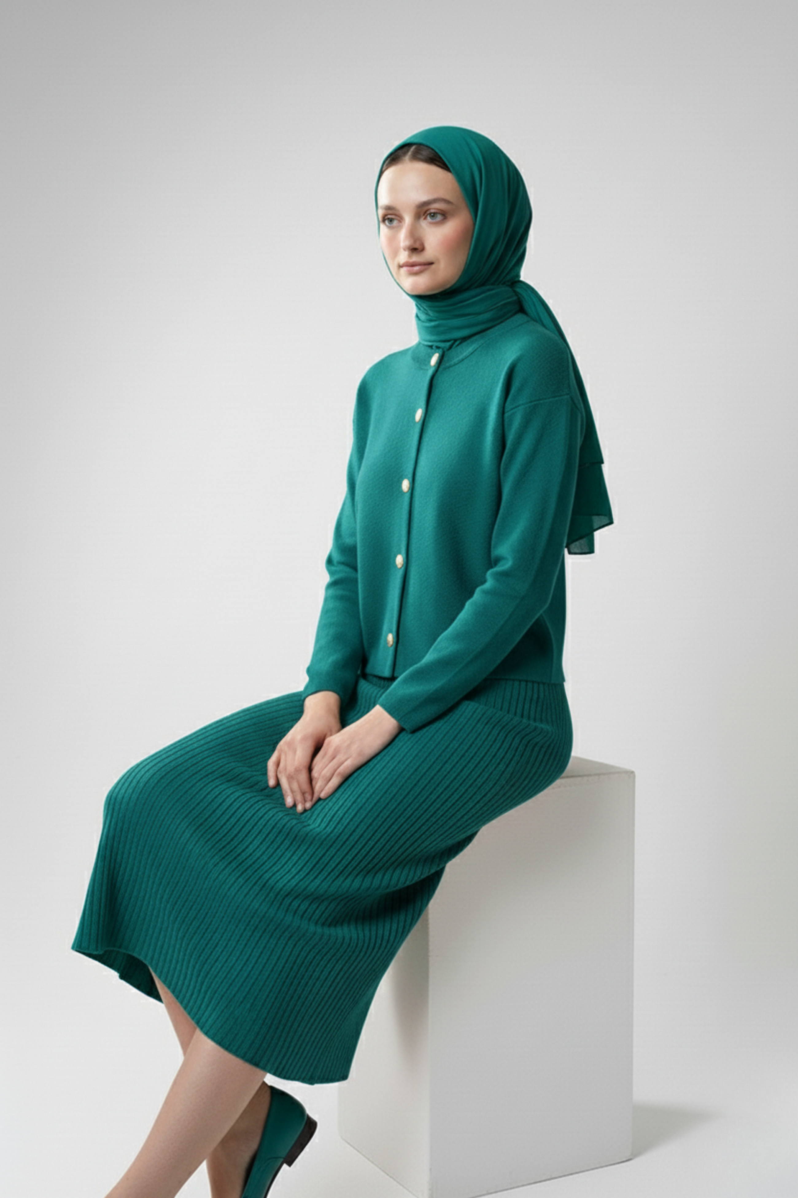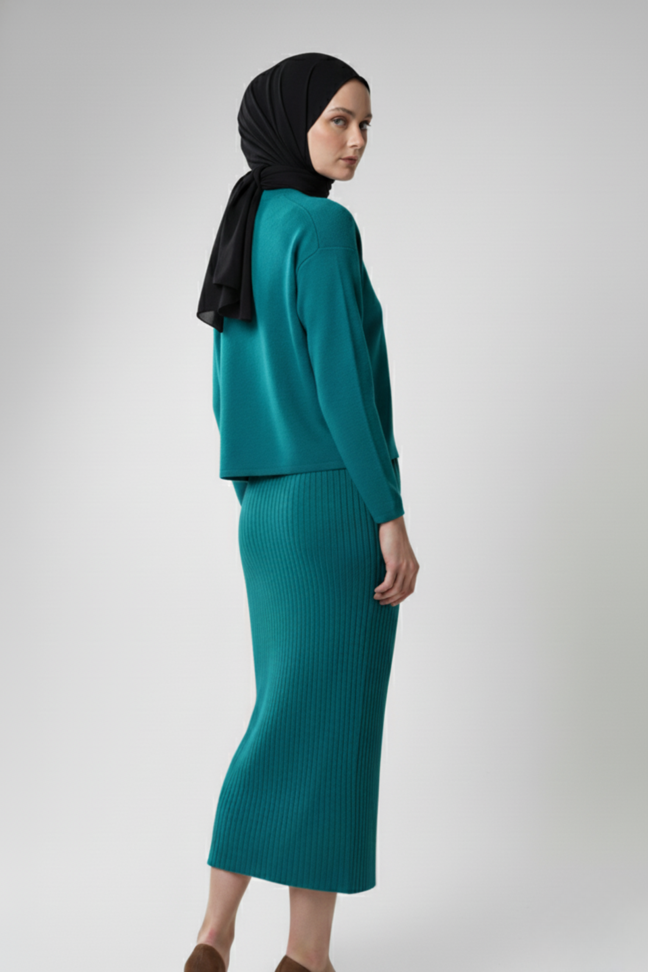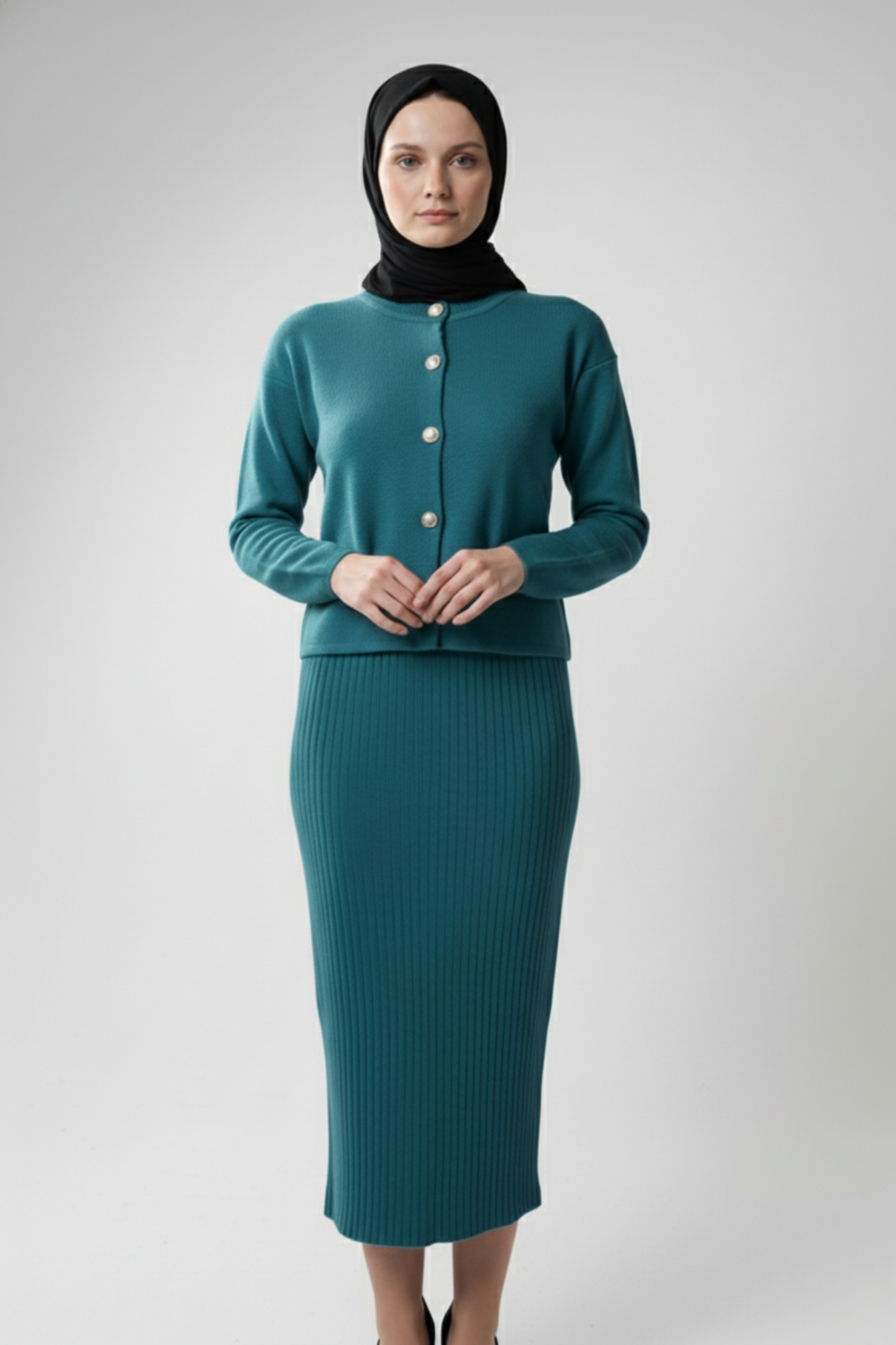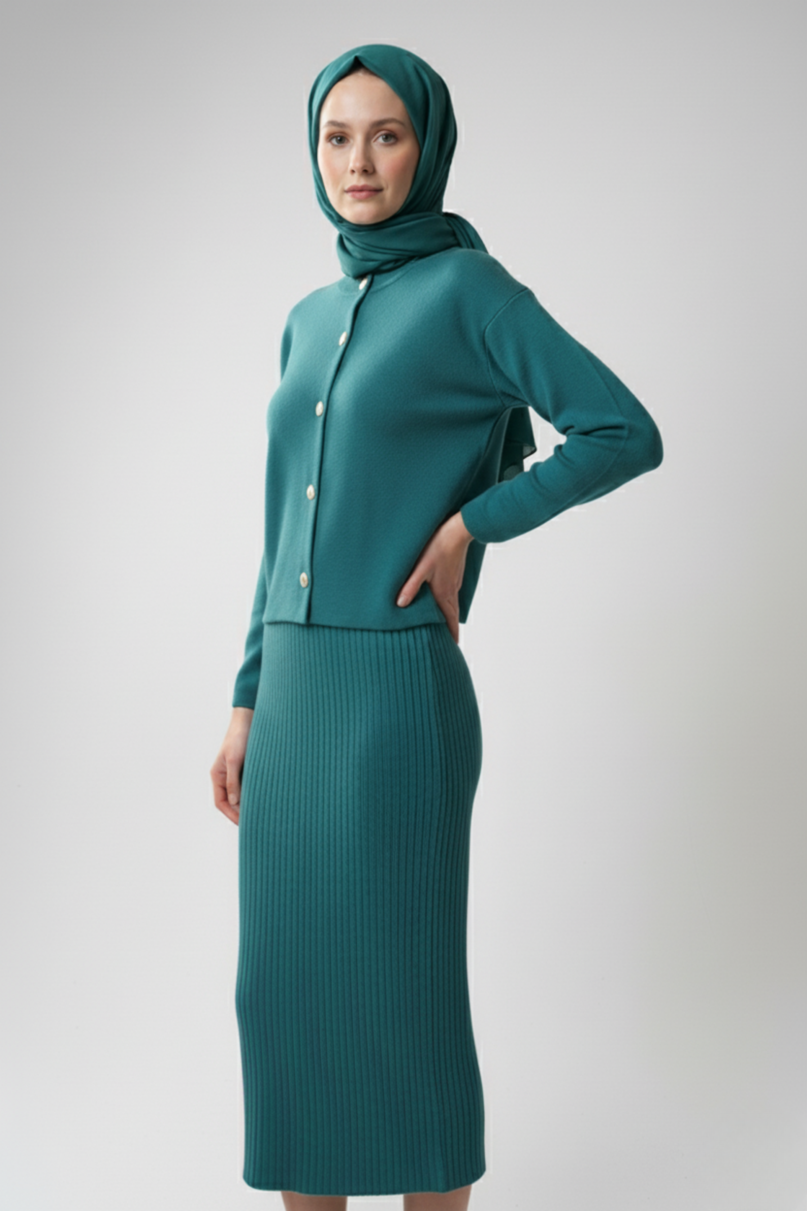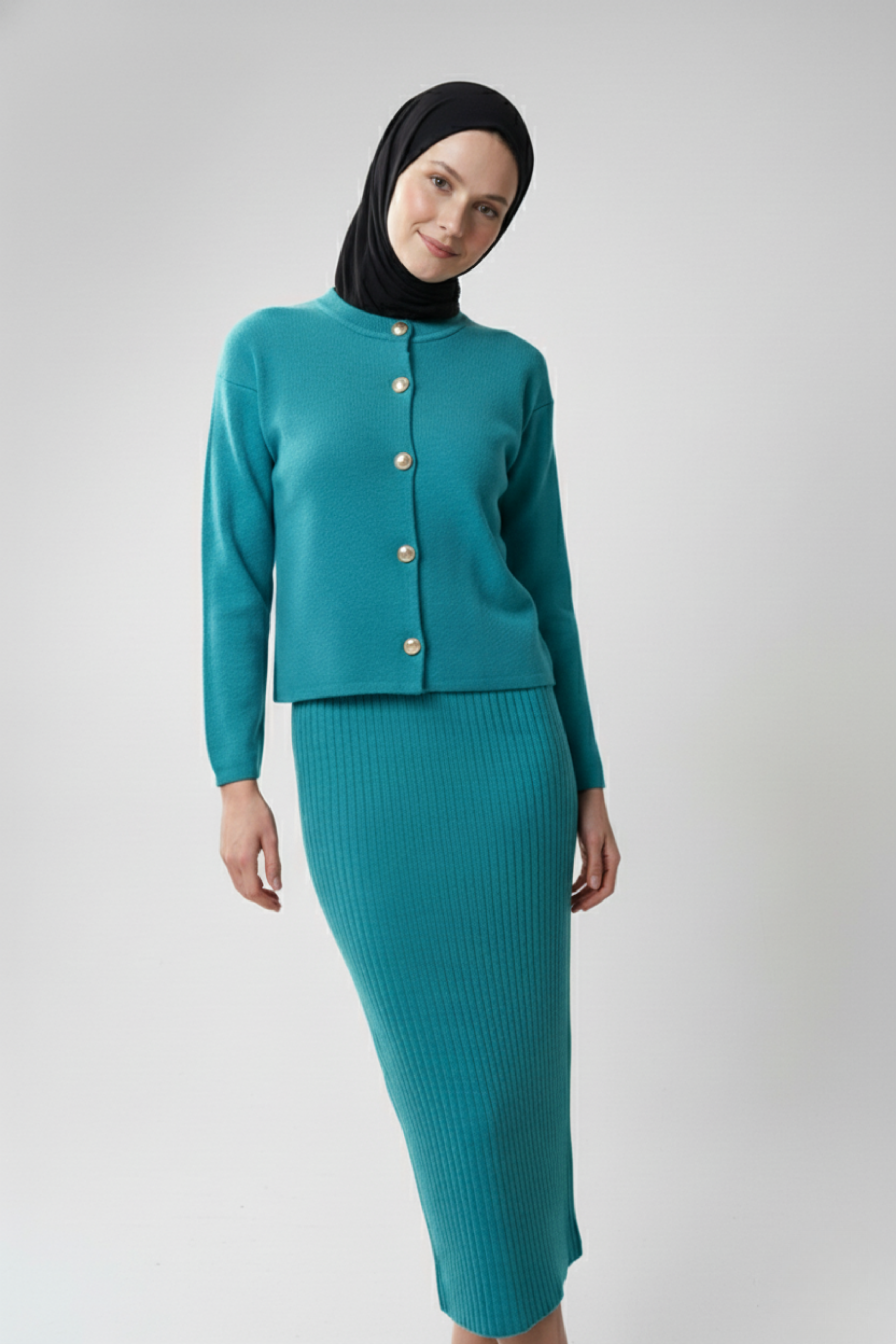 Kadın Turkuaz Hırka Elbise İkili Takım