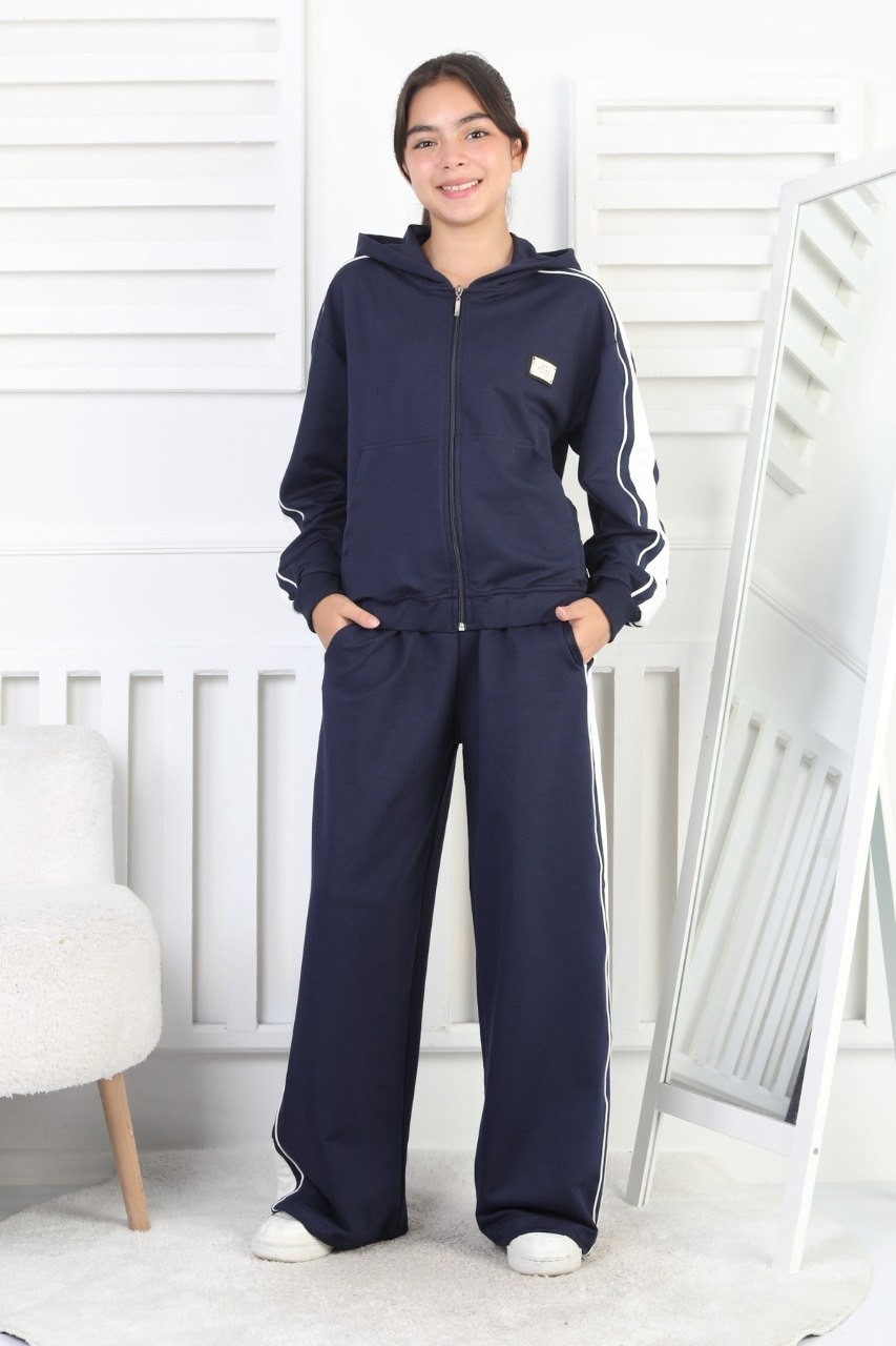 İki İplik Çizgili Kapşonlu Fermuarlı Kız Çocuk Takım