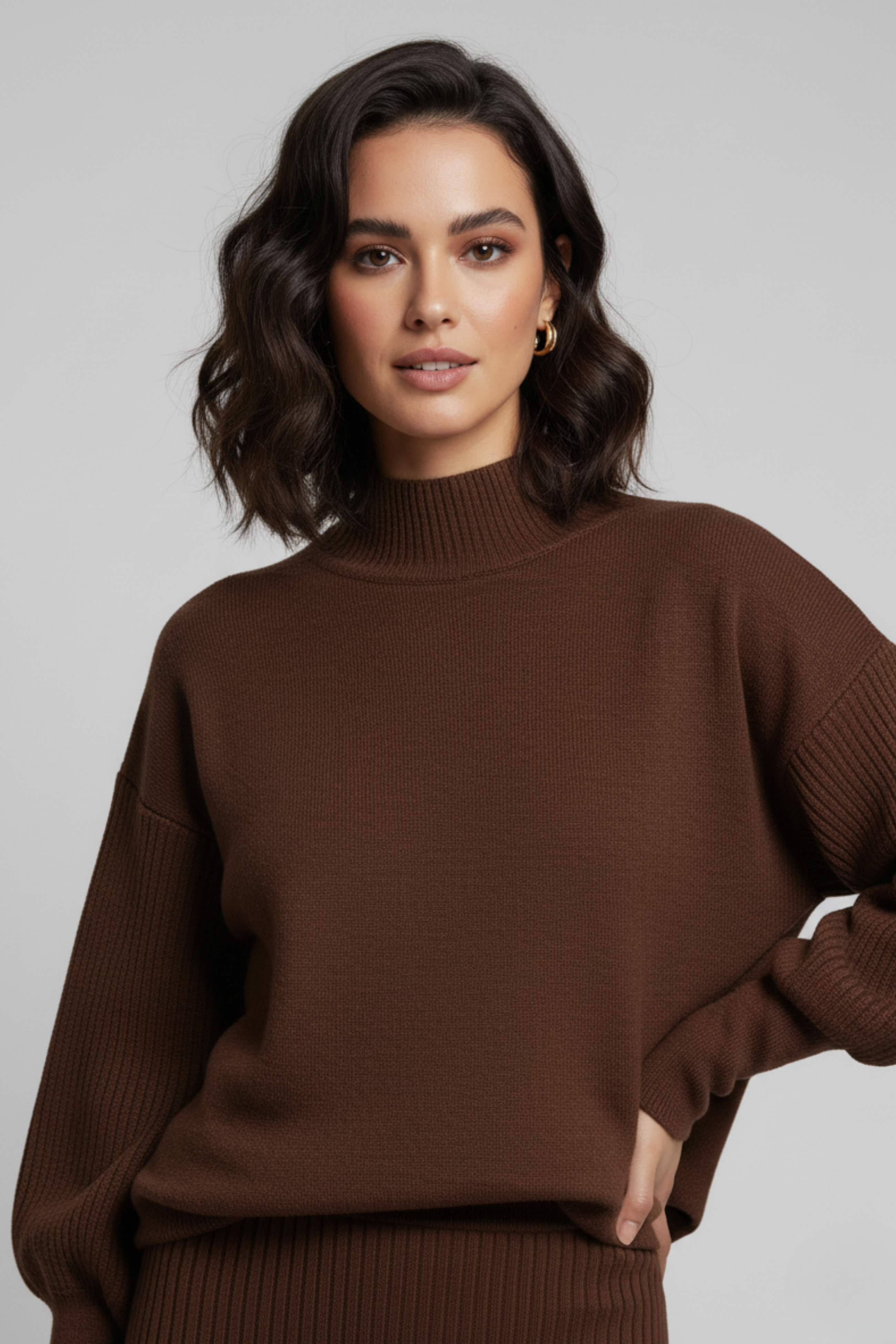 Triko Kahverengi Kazak ve Fitilli Elbise İkili Takım, zarif tasarımı ve modern kesimiyle şıklığı sade bir şekilde yansıtıyor. Şık jile elbise ve iç bluz uyumuyla hem rahat hem de dikkat çekici bir görünüm sunar. Günlük kombinlerden özel davetlere kadar her ortamda feminen bir duruş kazandıran bu takım, sezonun en trend parçalarından biri. Yumuşak dokusu ve kusursuz kalıbıyla konforu stilinle birleştir!