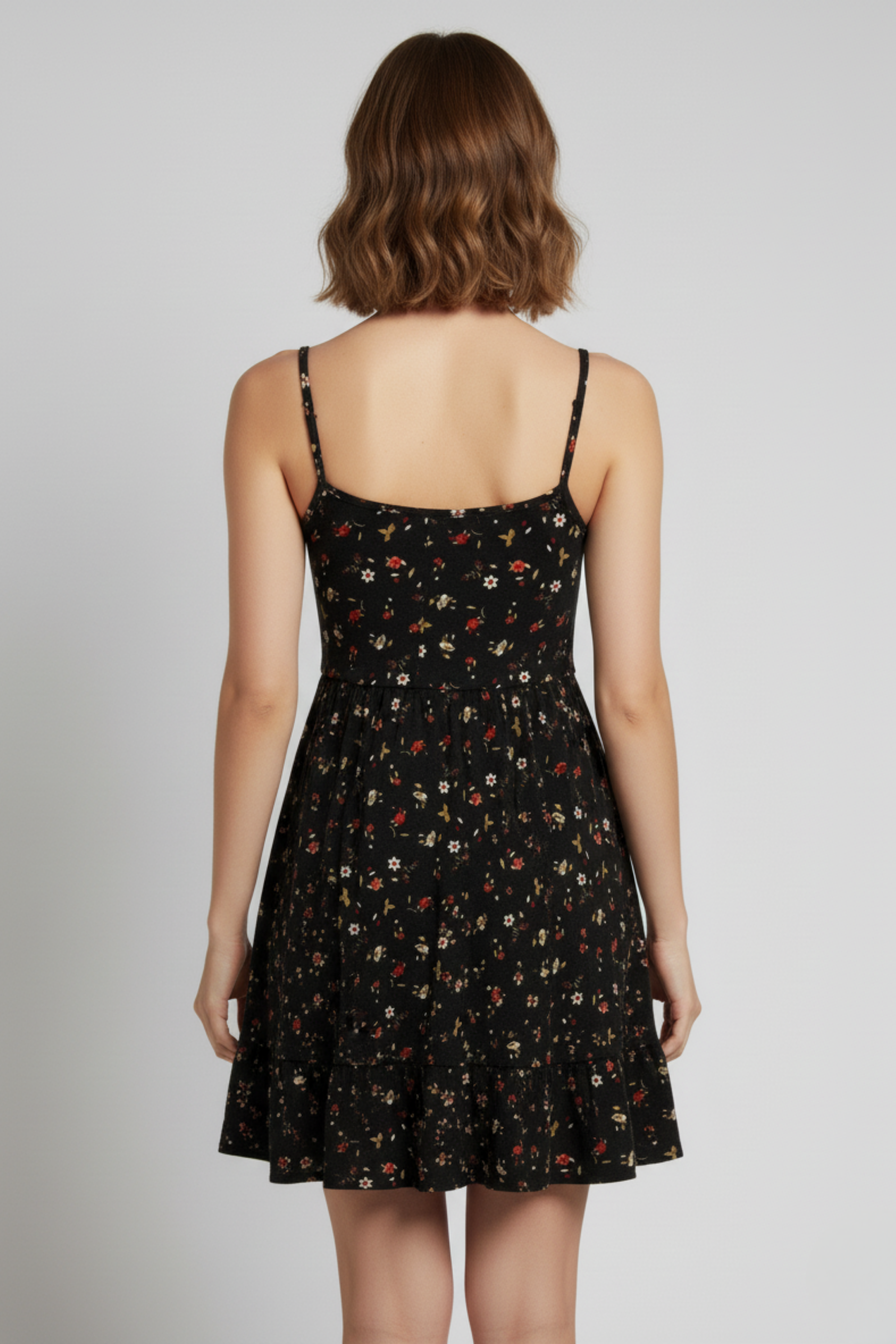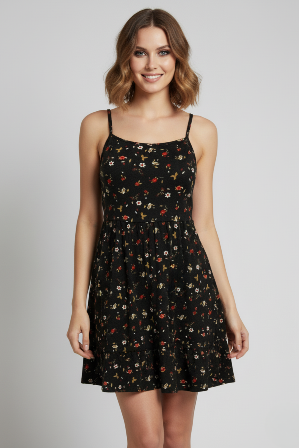 Feminen çizgileri ve çarpıcı detaylarıyla stilinizi ön plana çıkaran İp Askılı Çiçek Desenli Siyah Krep Mini Elbise, zarafet ve dinamizmi bir arada sunuyor. İnce askı detayı ile zarif bir görünüm kazandırırken, modern çiçek deseni siyah fon üzerinde etkileyici bir kontrast oluşturarak şık bir duruş sergiler.