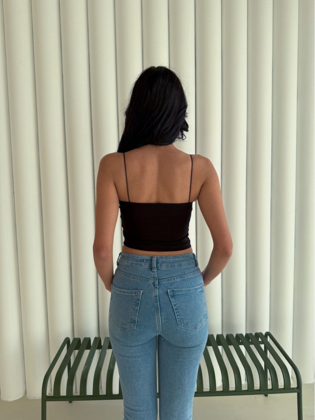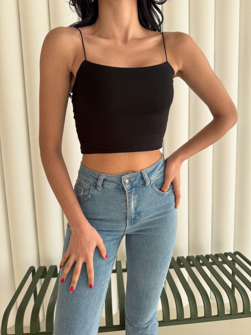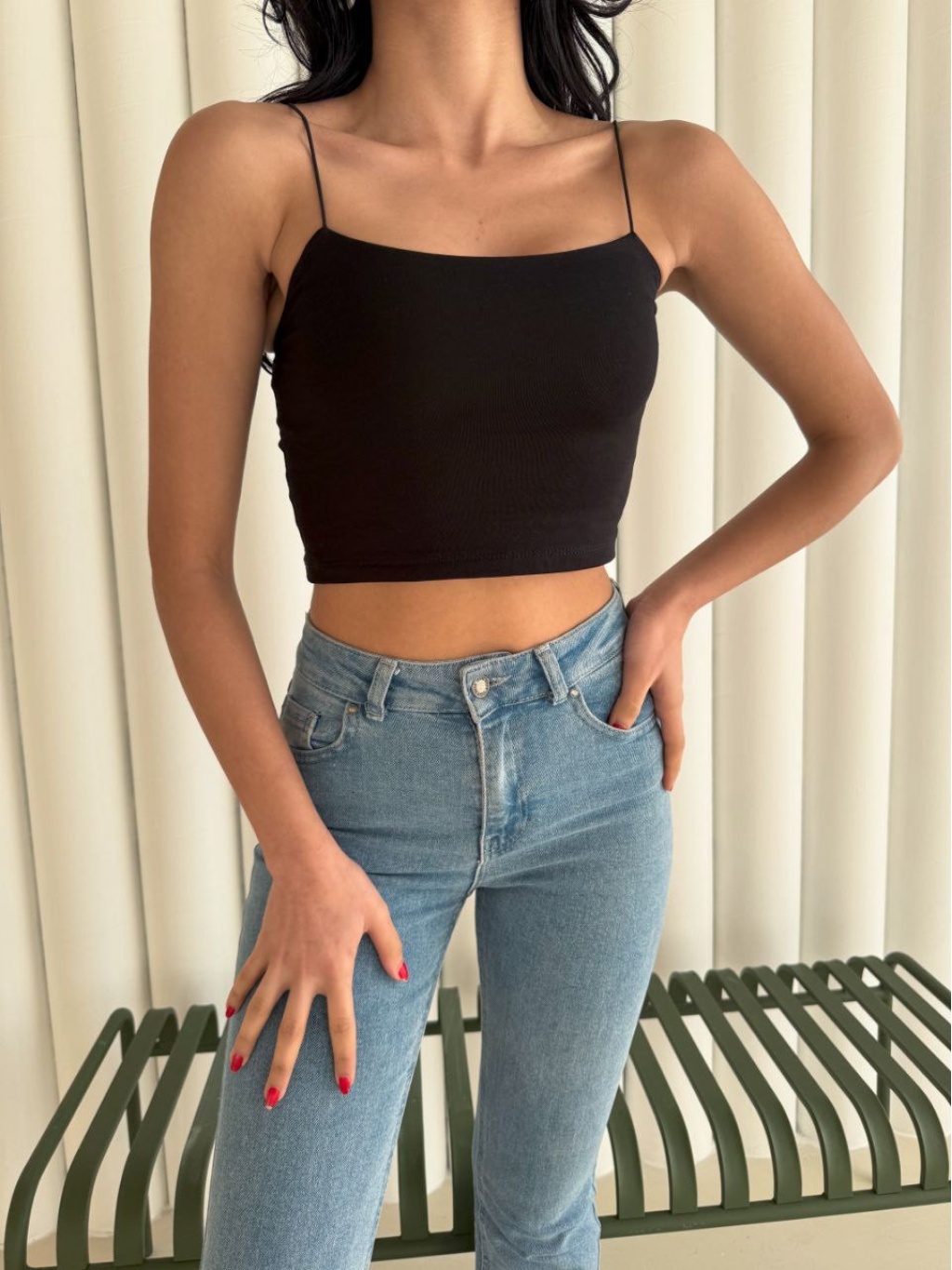 İnce ip askılarıyla zarif bir duruş kazandıran bu crop, siyah rengin asaletini minimal bir tasarımla buluşturur. Günlük kombinlerde kot ya da şortla spor bir hava yakalayabilir, akşam kombinlerinde ise etek veya ceketle şıklığını ön plana çıkarabilirsin.