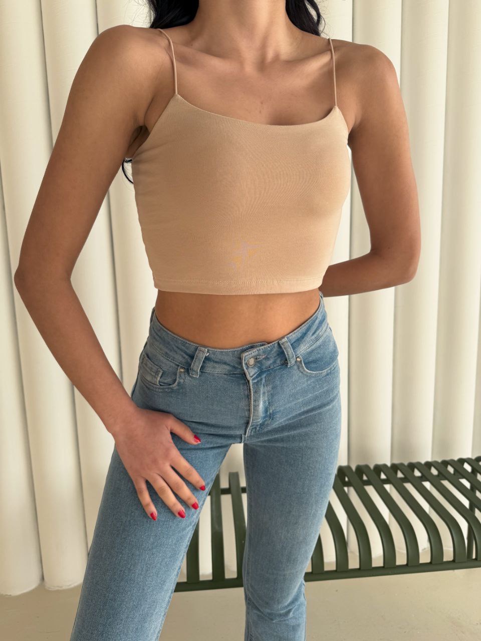 İnce ip askıları sayesinde feminen bir duruş kazandırırken, ten rengi tonuyla zarif ve modern bir hava yaratır. İster günlük bir stile, ister daha iddialı bir kombinle tercih et — bu parça her durumda seni ön plana çıkarır.