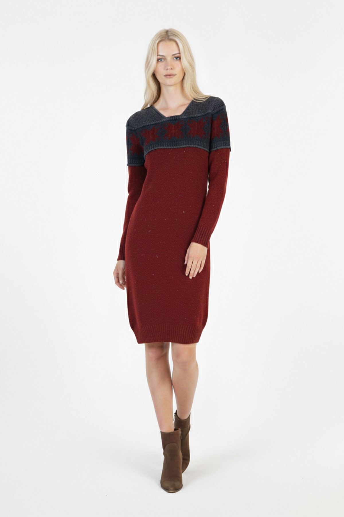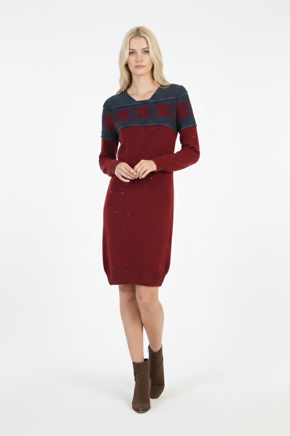 · Kadın bordo kar tanesi desenli mini triko kazak elbise, kış stiline enerjik bir hava katar.;