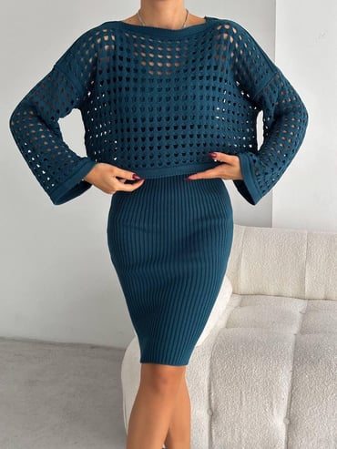 Şıklığı sade dokunuşlarla seven kadınlara özel tasarlanan bu petrol renk triko ikili takım, delikli örgü detaylı kazak ve askılı elbiseden oluşan şık ve pratik bir set sunar.