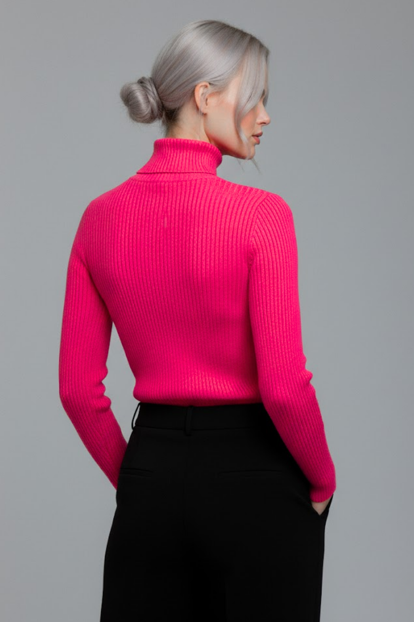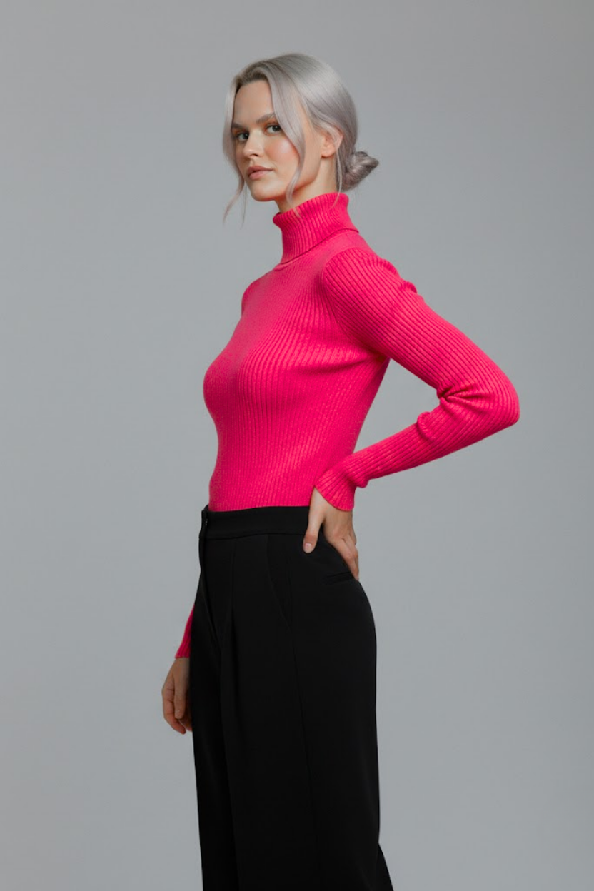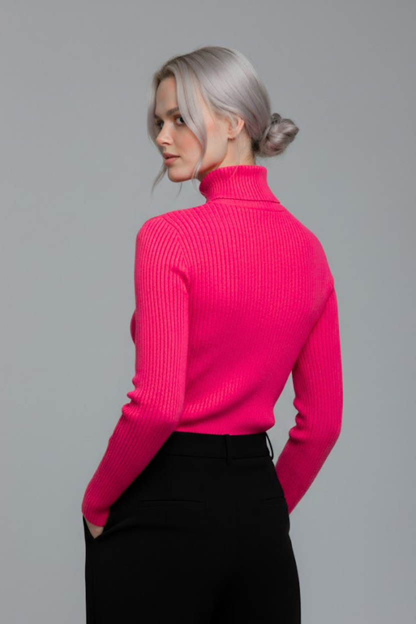 Gardırobunuzun en canlı ve en konforlu parçasıyla tanışın. Bu fuşya pembe boğazlı kazak, özel dokuma teknolojisi sayesinde dokusu yumuşacık bir yapıya sahiptir. Kaşındırma yapmaz, teninizde ipeksi bir his bırakır.