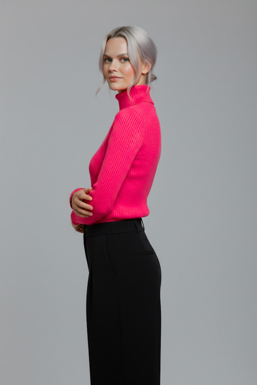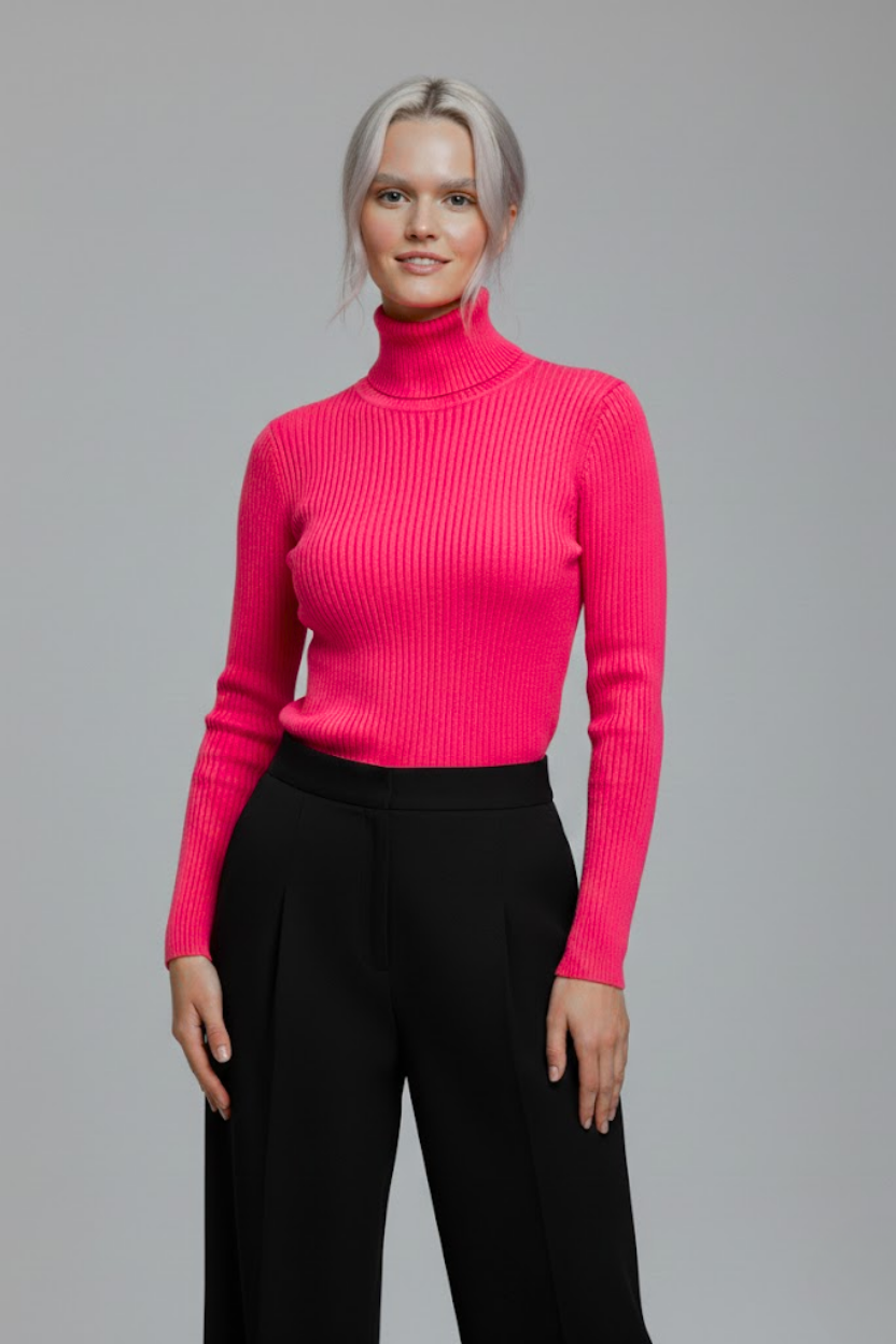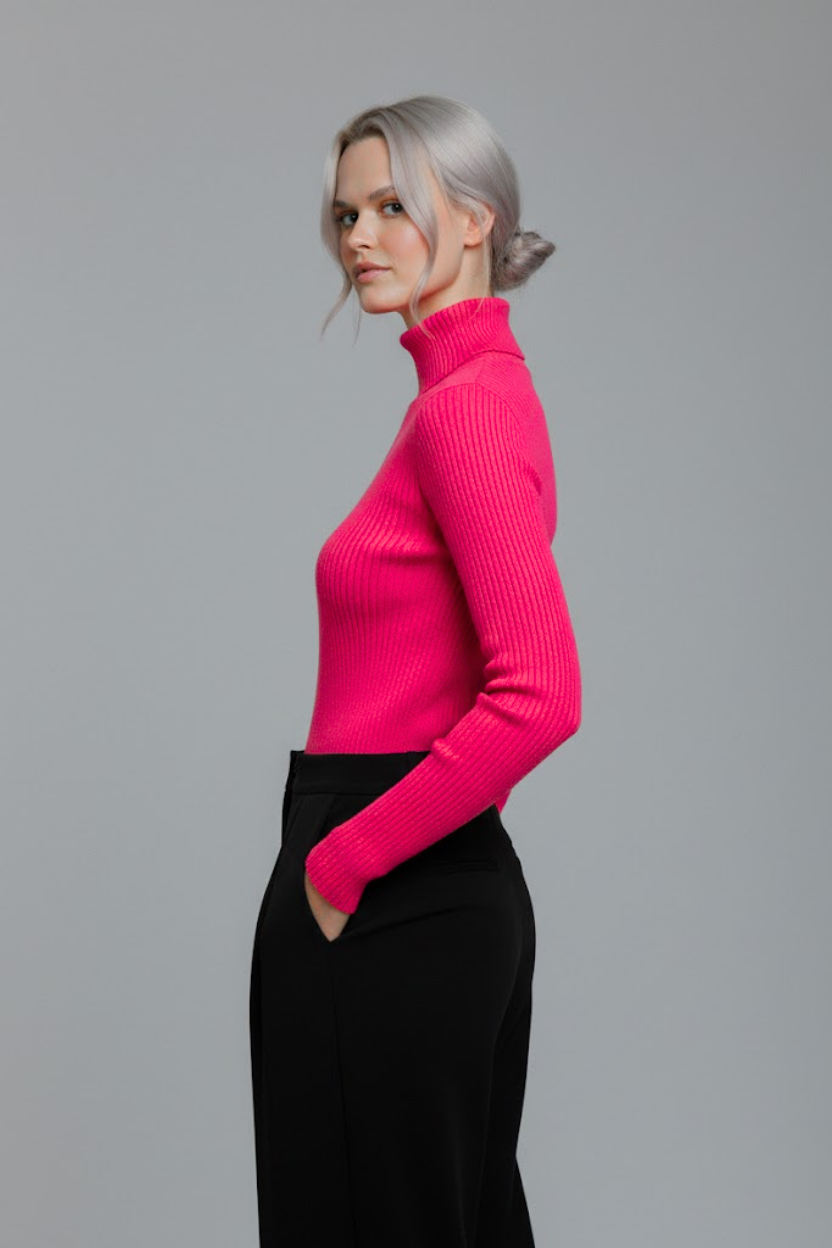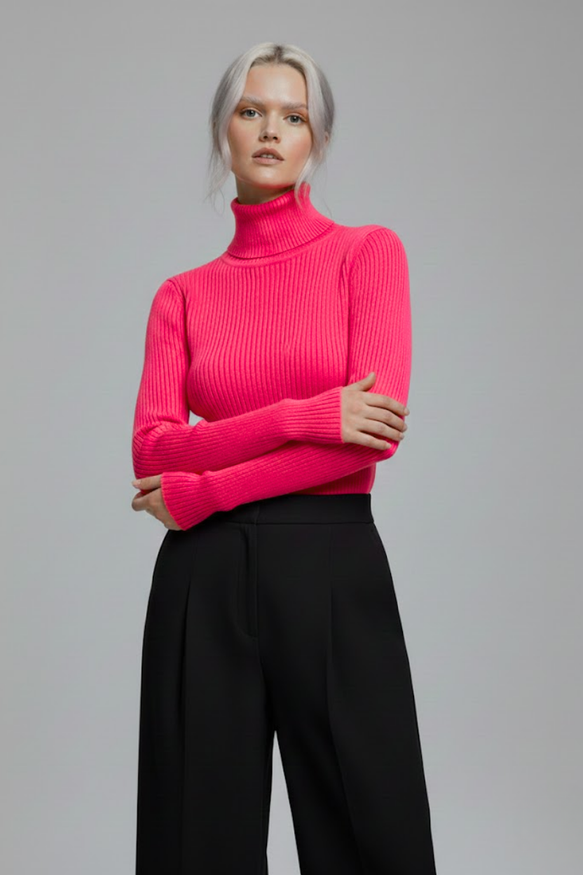Gardırobunuzun en canlı ve en konforlu parçasıyla tanışın. Bu fuşya pembe boğazlı kazak, özel dokuma teknolojisi sayesinde dokusu yumuşacık bir yapıya sahiptir. Kaşındırma yapmaz, teninizde ipeksi bir his bırakır.