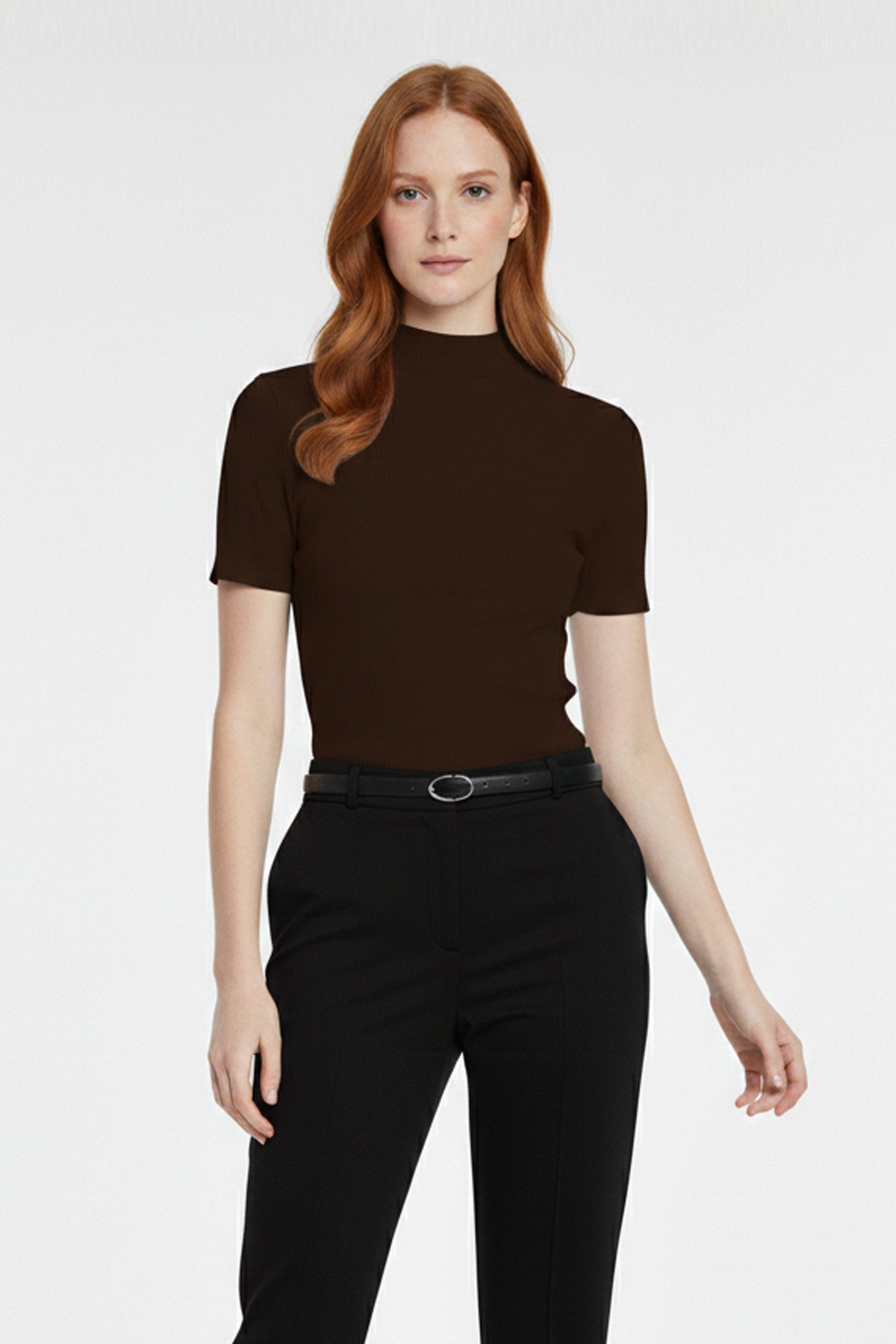 Kadın Kahve Viskon Yarım Balıkçı Yaka Kısa Kollu Kompakt Slim Fit Likralı Basic Günlük Body Bluz