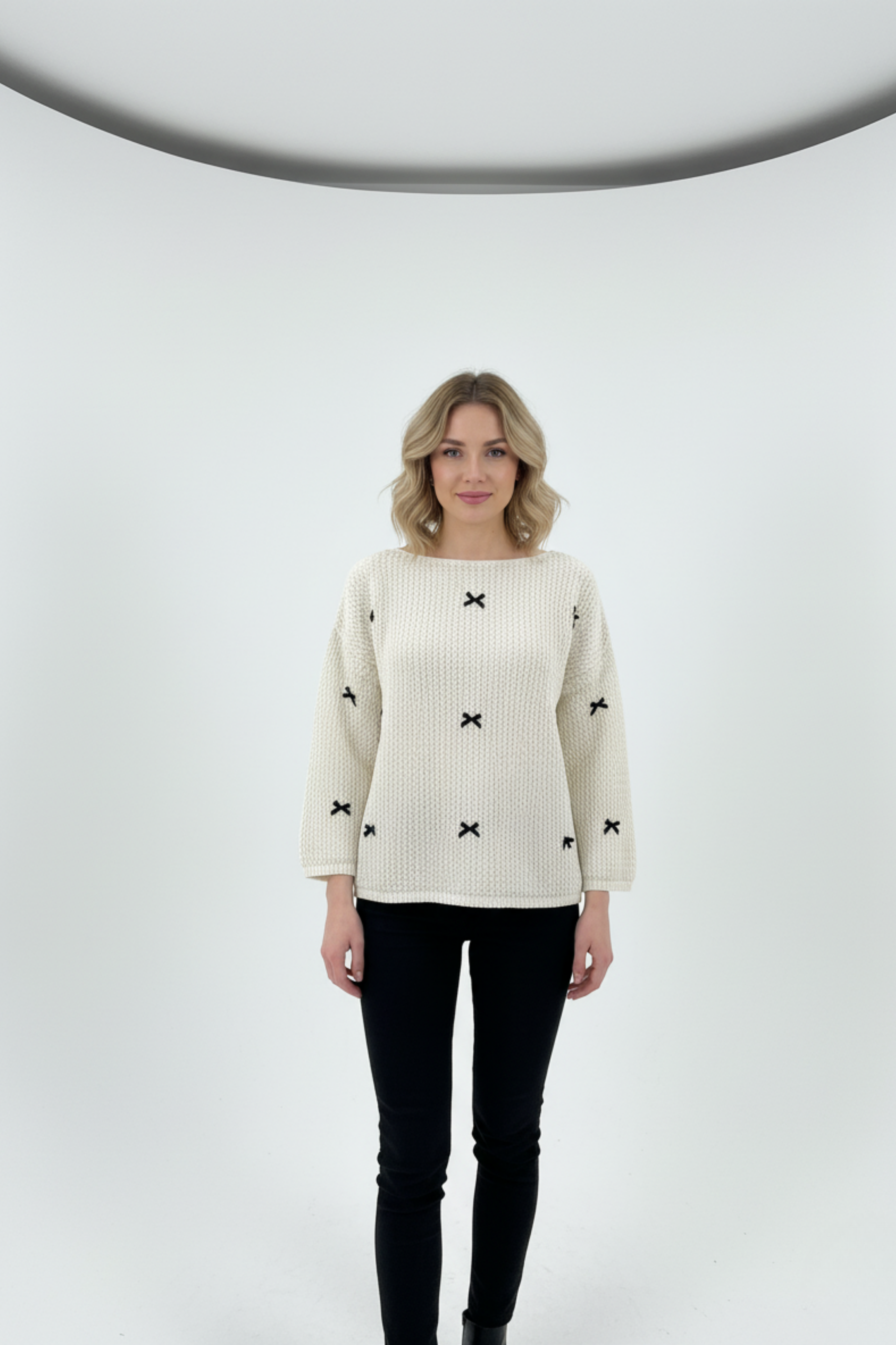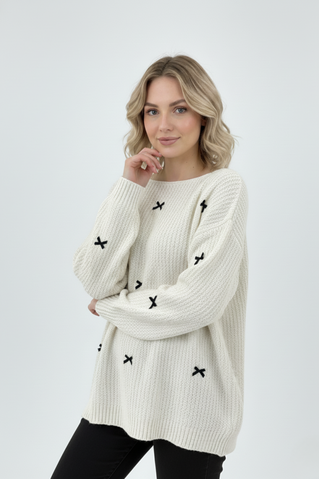 Konforlu ve şık bir görünüm arayanlar için tasarlandı. Kazaktaki ajurlu örgü deseni, ürüne modern ve havalı bir dokunuş katarken, omuzlarda veya yaka kısmındaki zarif kurdele detayları feminen bir şıklık sunar.