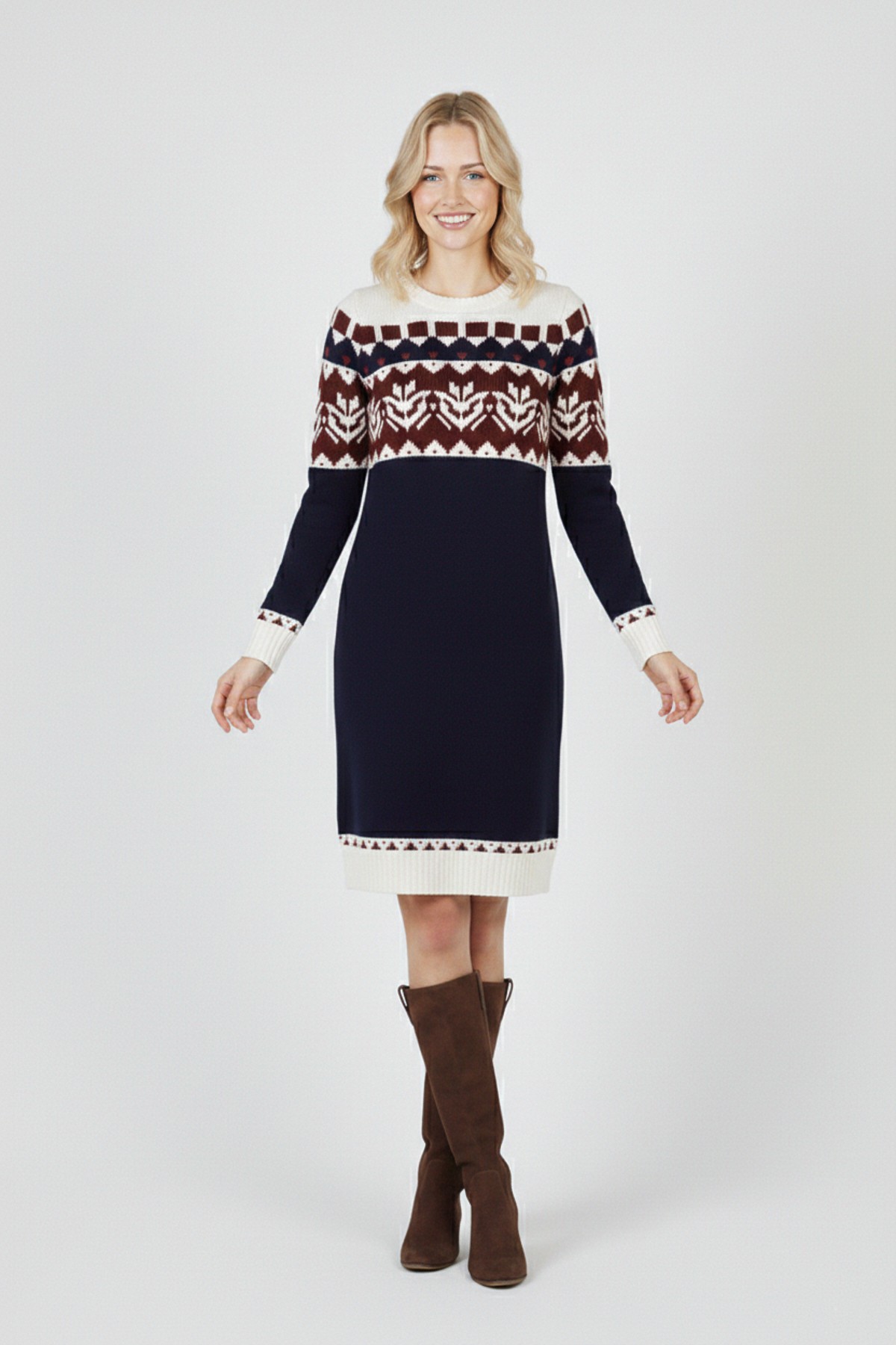 · Kadın lacivert desenli triko elbise, şık ve modern görünüm sunar.;