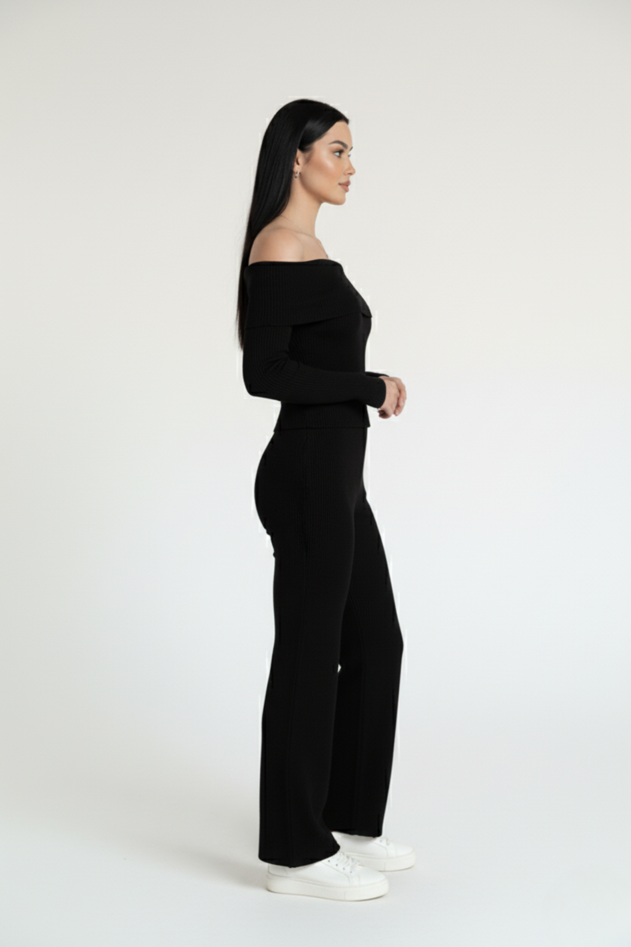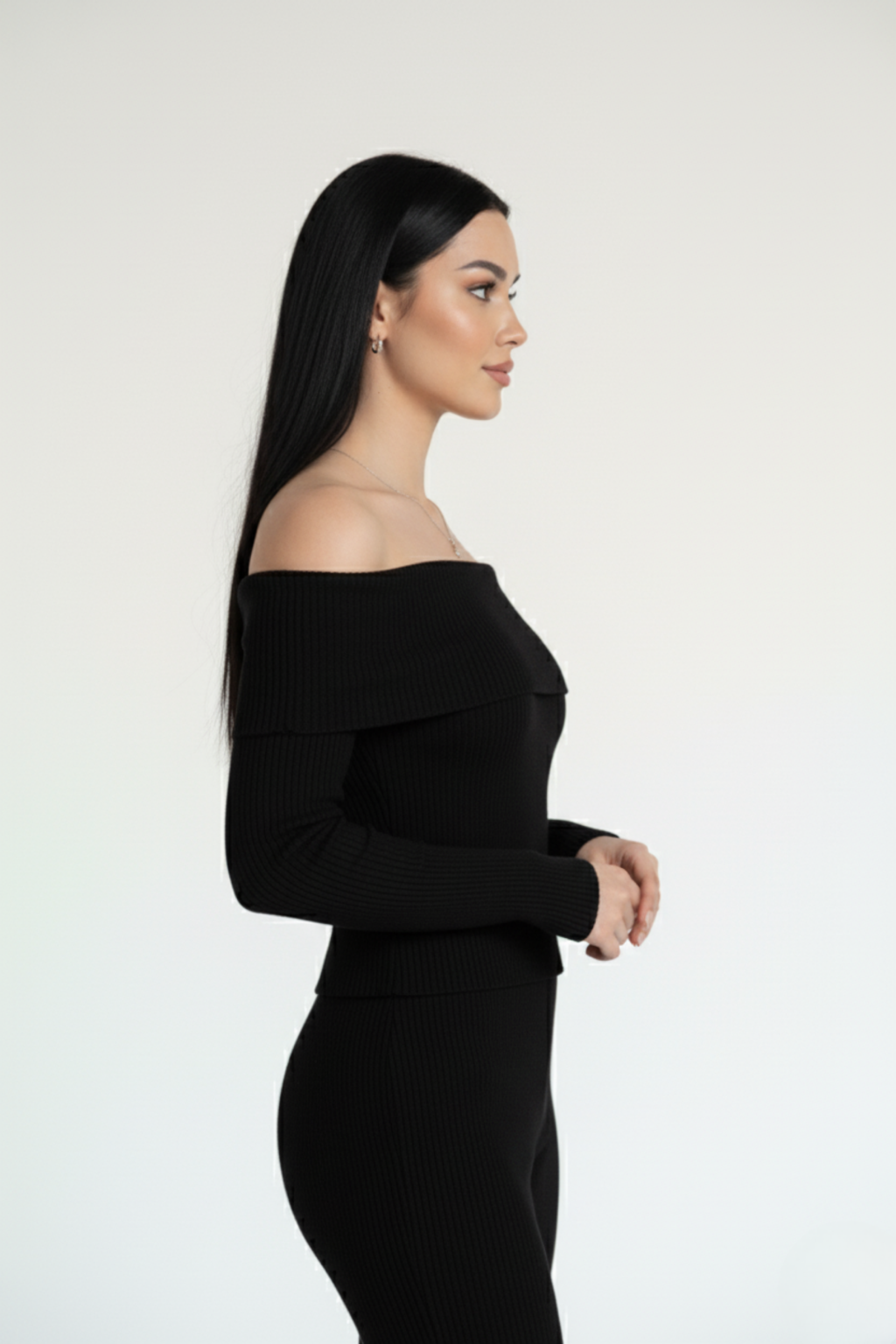 Madonna yaka detayıyla tasarlanan bu siyah alt üst takım, modernliği ve feminen zarafeti tek bir parçada buluşturuyor. Özel günlerinizden şık davetlerinize kadar her ortamda kusursuz bir siluet oluşturmanızı sağlar.