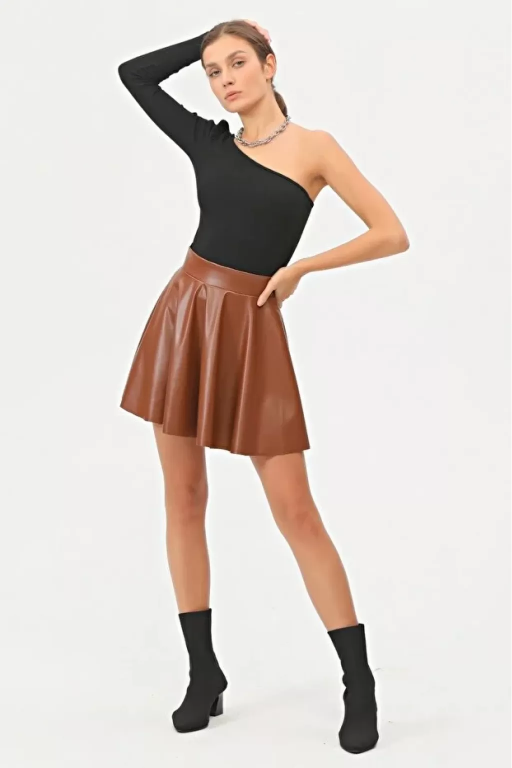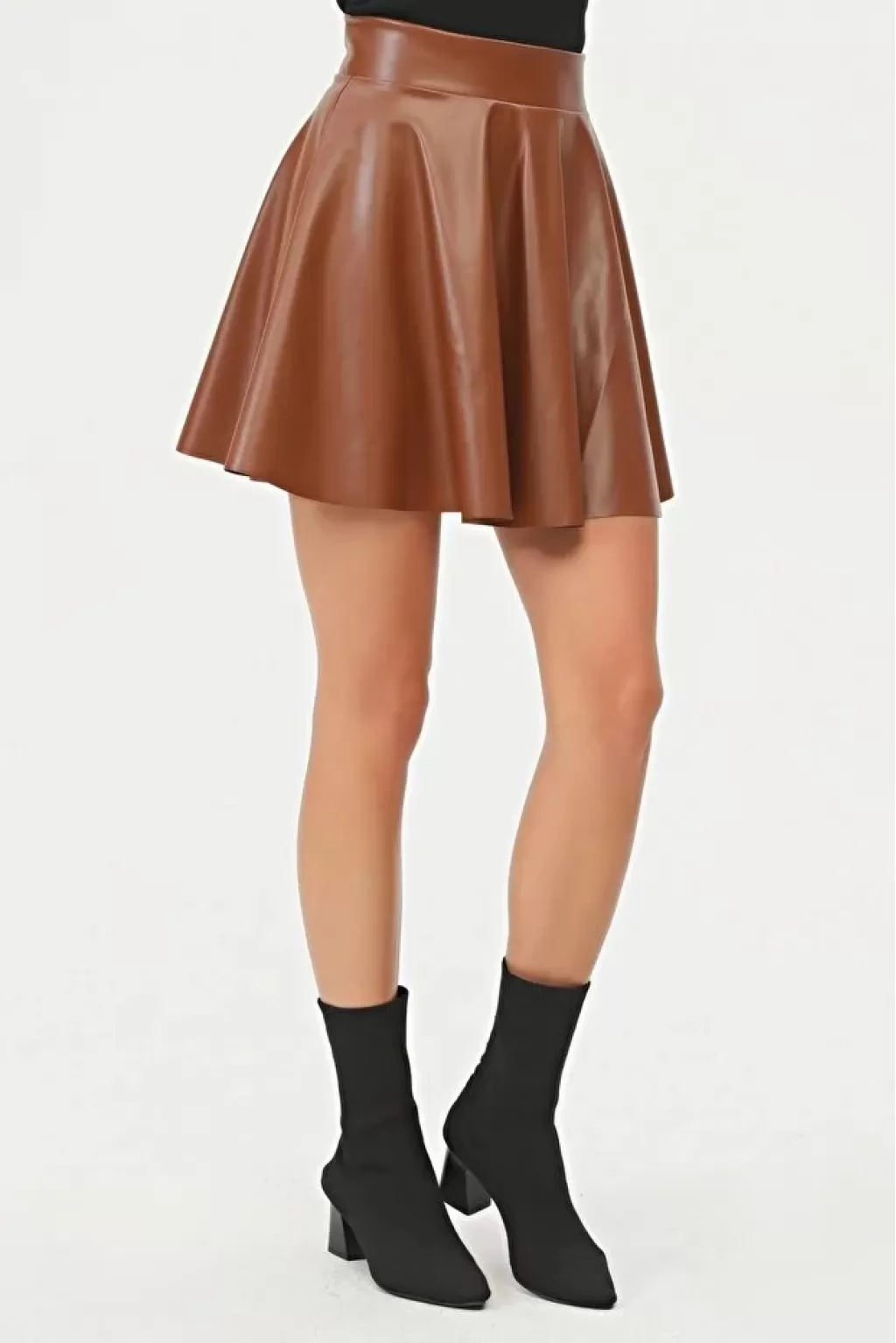 Kadın Mini Kloş Taba Renkli Suni Deri Etek