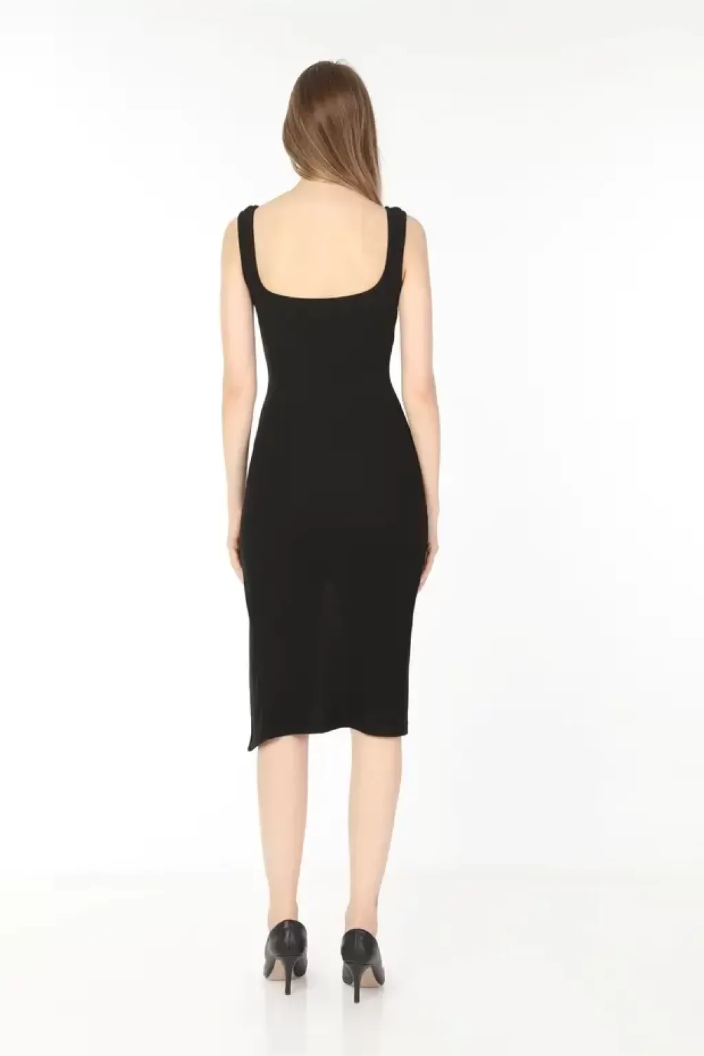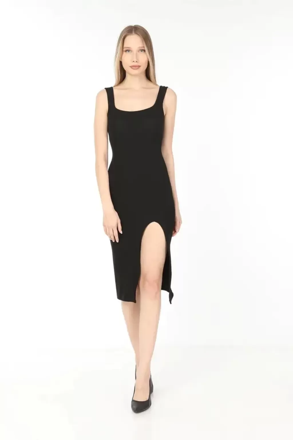 Bele oturan kalıbı, vücut hatlarını zarifçe sararak feminen bir siluet ortaya çıkarırken, yırtmaç detayı hareket özgürlüğü ve modern bir çekicilik kazandırır. Midi boy uzunluğu sayesinde bu elbise, hem günlük kombinlerde hem de özel davetlerde kusursuz bir şıklık sunar.