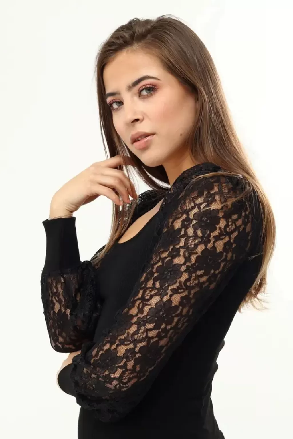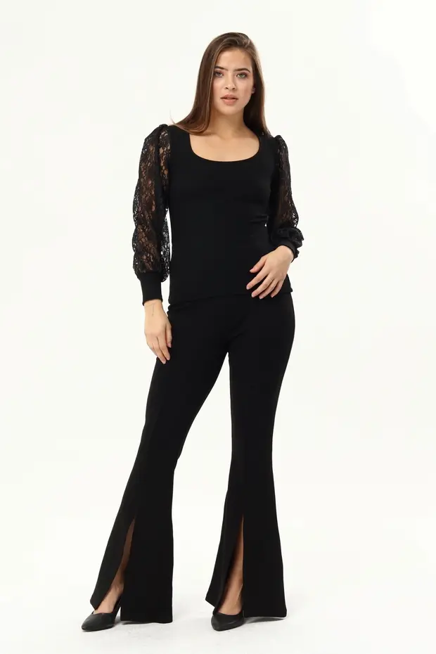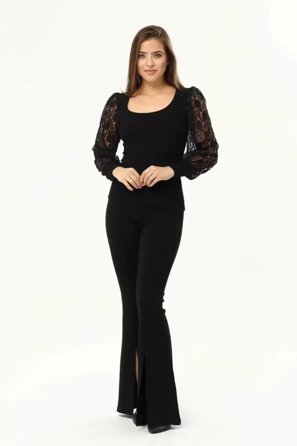 Kare Yaka Dantelli Viskon Uzun Kollu Bluz