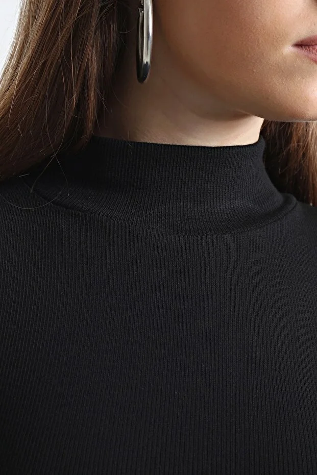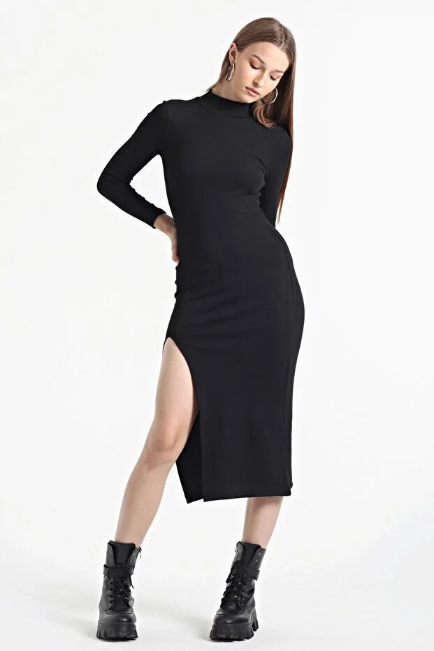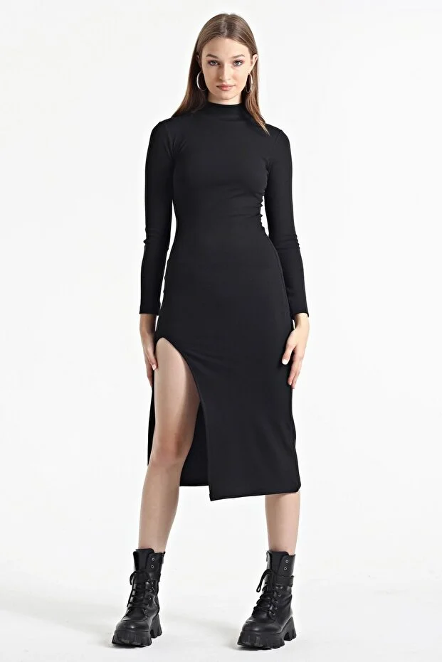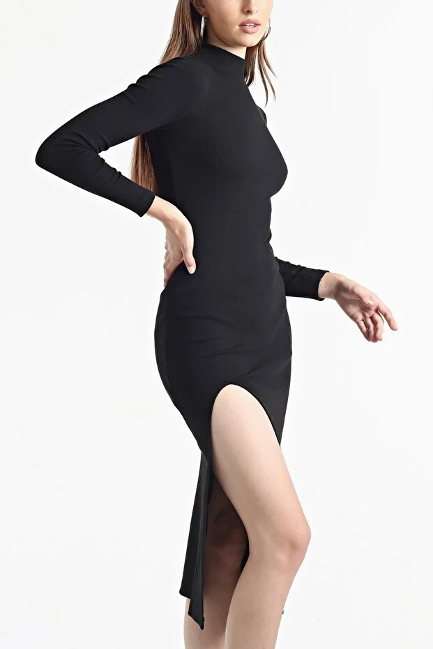 Kadın Siyah Yarım Balıkçı Tek Taraf Yırtmaçlı Uzun Kol Elbise