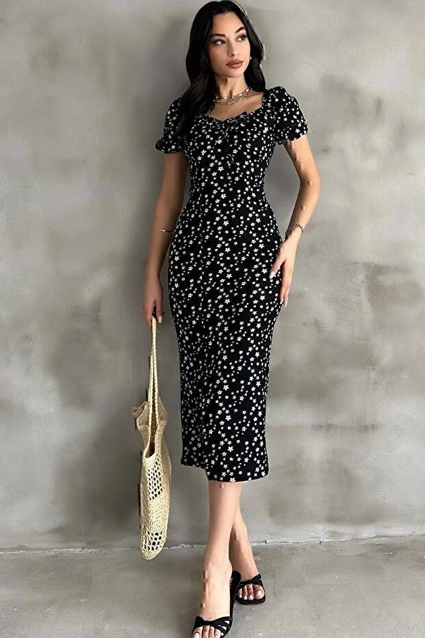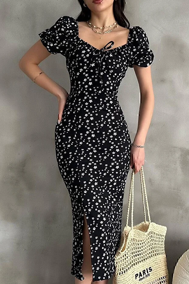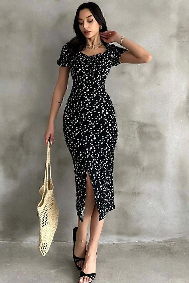 Kadın Siyah Çiçek Desenli Yırtmaçlı Midi Elbise Kare Yaka Büzgü Detaylı