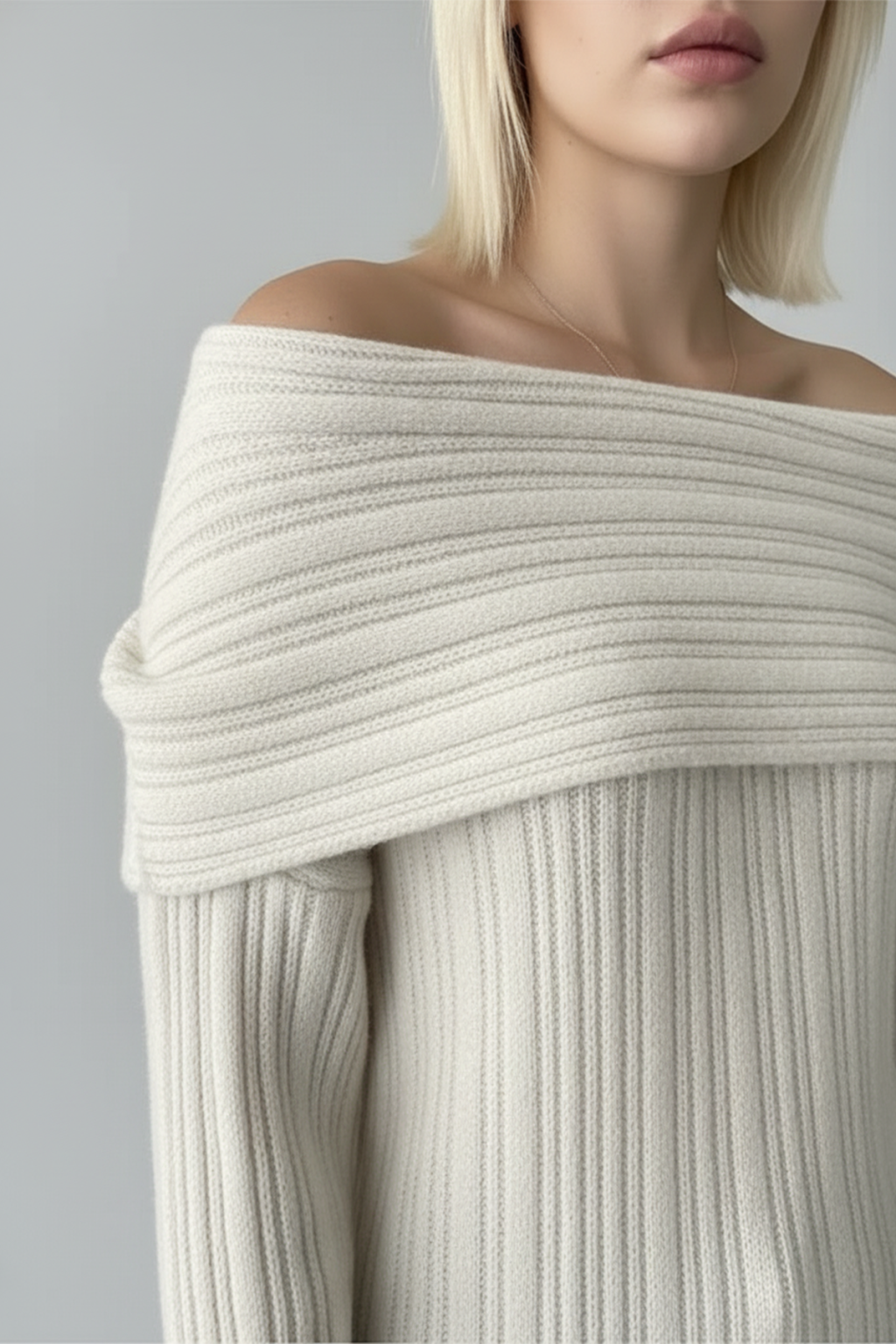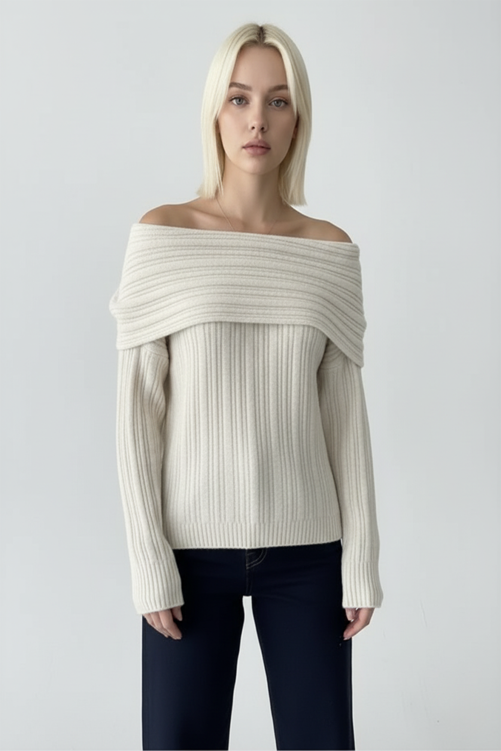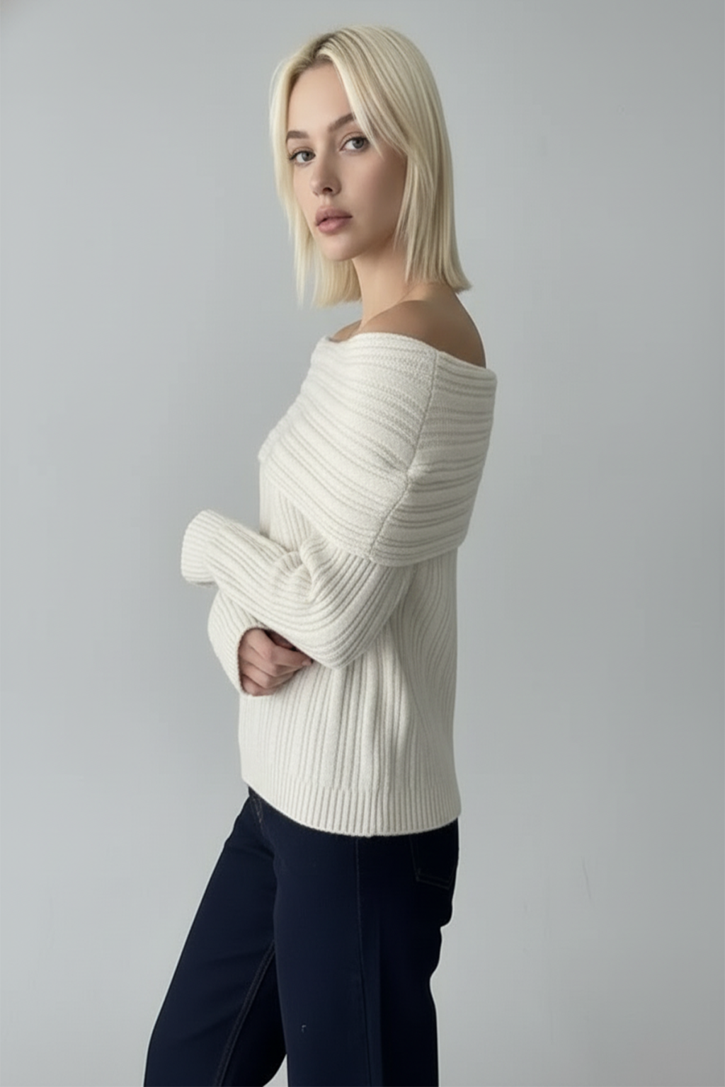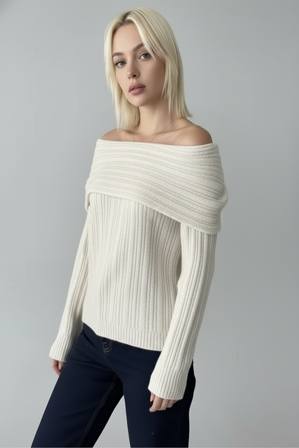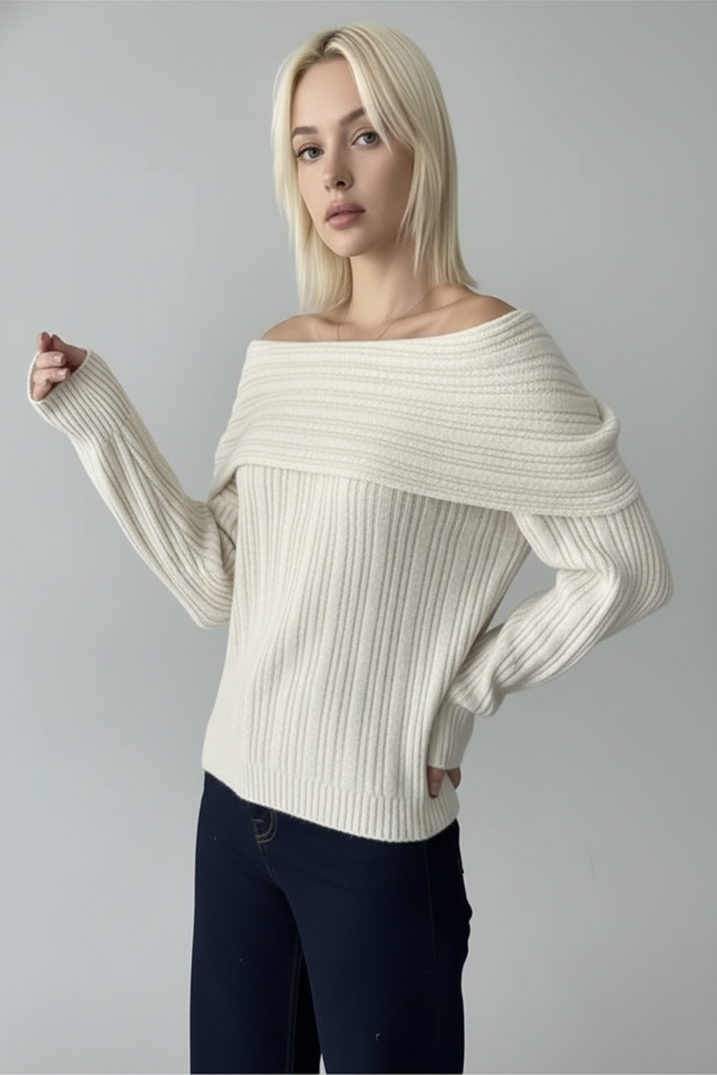 Fitilli Krem Rengi Madonna Yaka Kazak, zarif görünümü ve modern tasarımıyla stilinizi ön plana çıkarıyor. Madonna yaka detayı, omuzları zarifçe vurgulayarak feminen bir duruş kazandırırken, fitilli triko dokusu vücudu kusursuz şekilde sarar. Krem rengin sade ve sofistike tonları, her kombine kolayca uyum sağlar. Günlük şıklıkta ya da özel davetlerde rahatlıkla tercih edebileceğiniz bu kazak, gardırobunuzun vazgeçilmez parçası olacak!