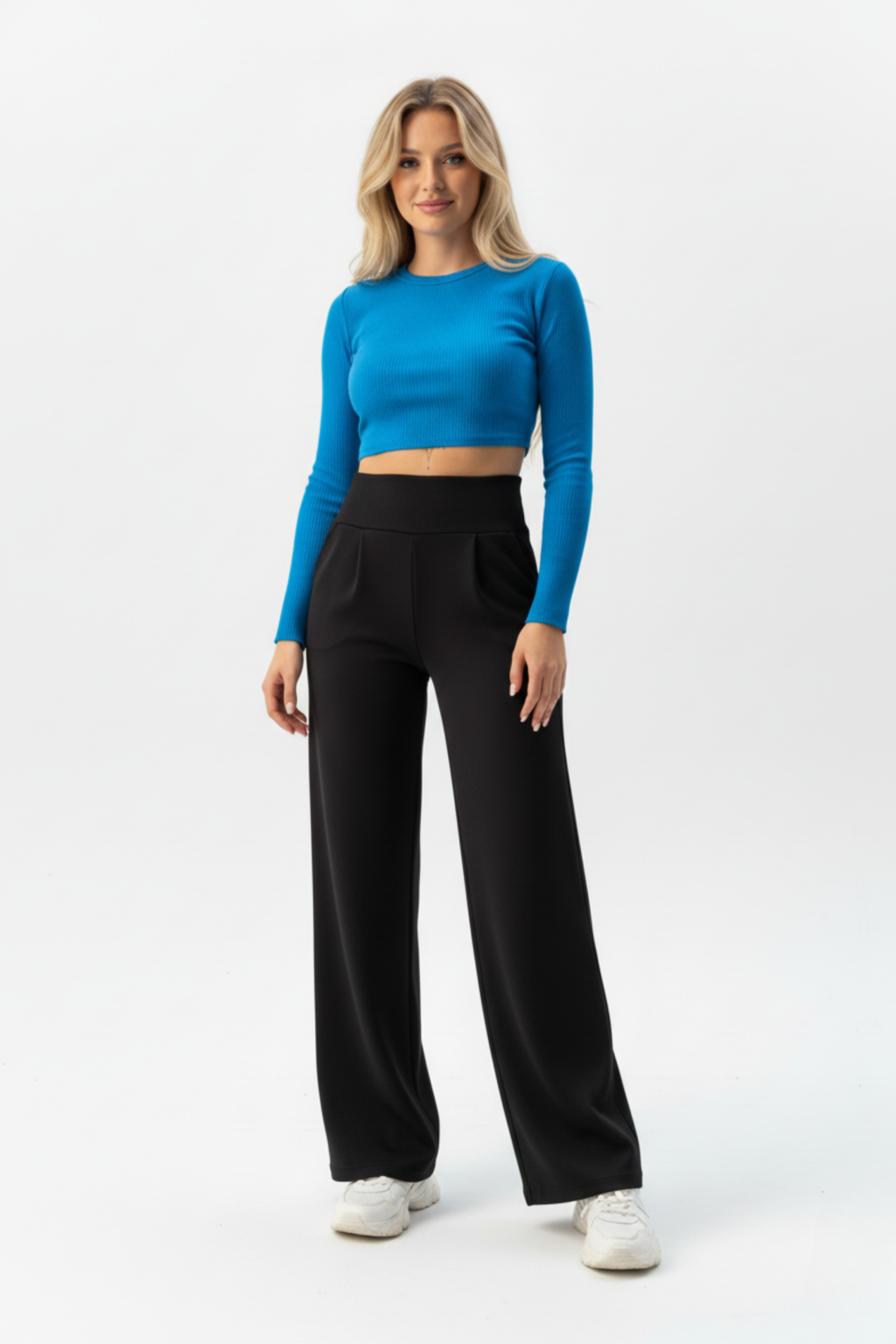 Kadın Toparlayıcı Çıma Detaylı Yüksek Bel Scuba Krep Palazzo Pantolon - Siyah