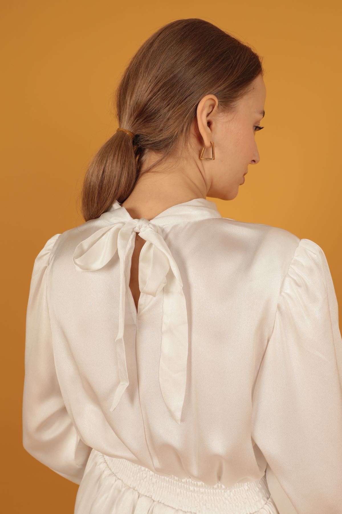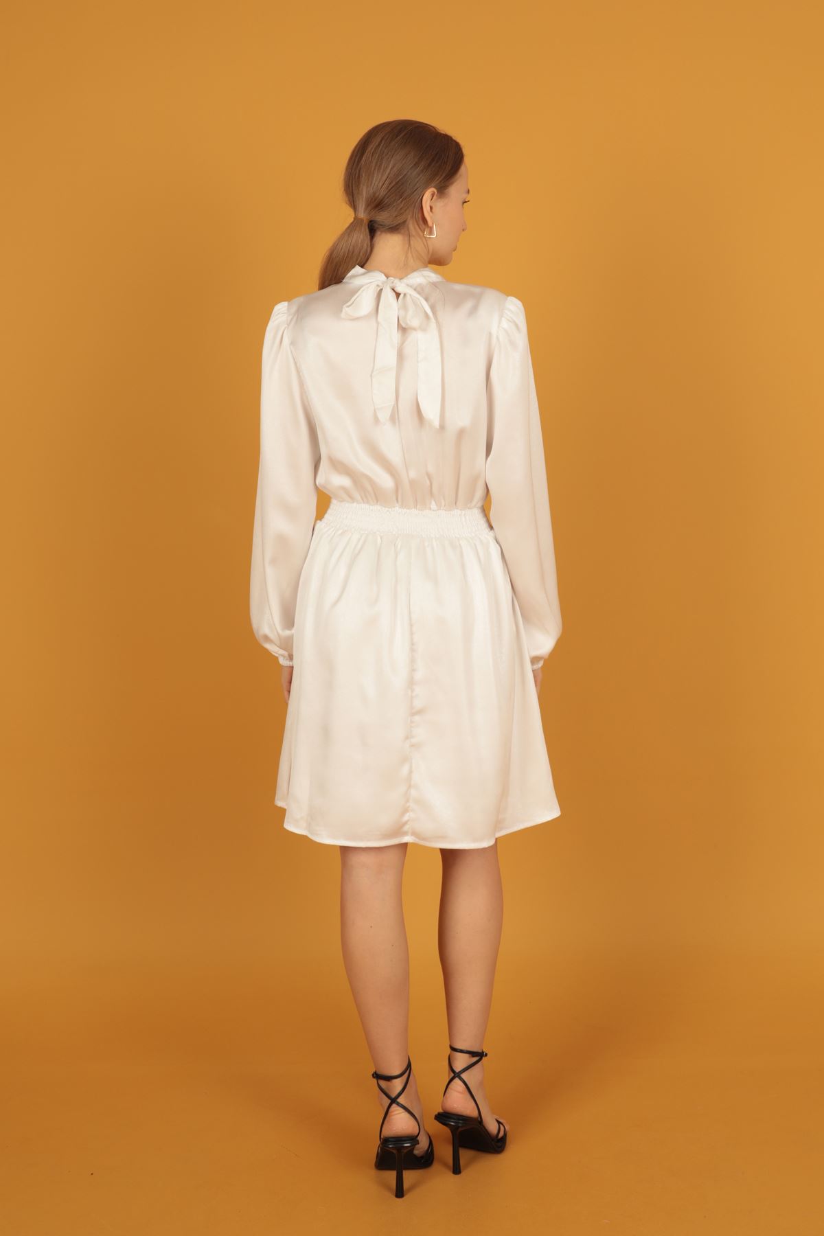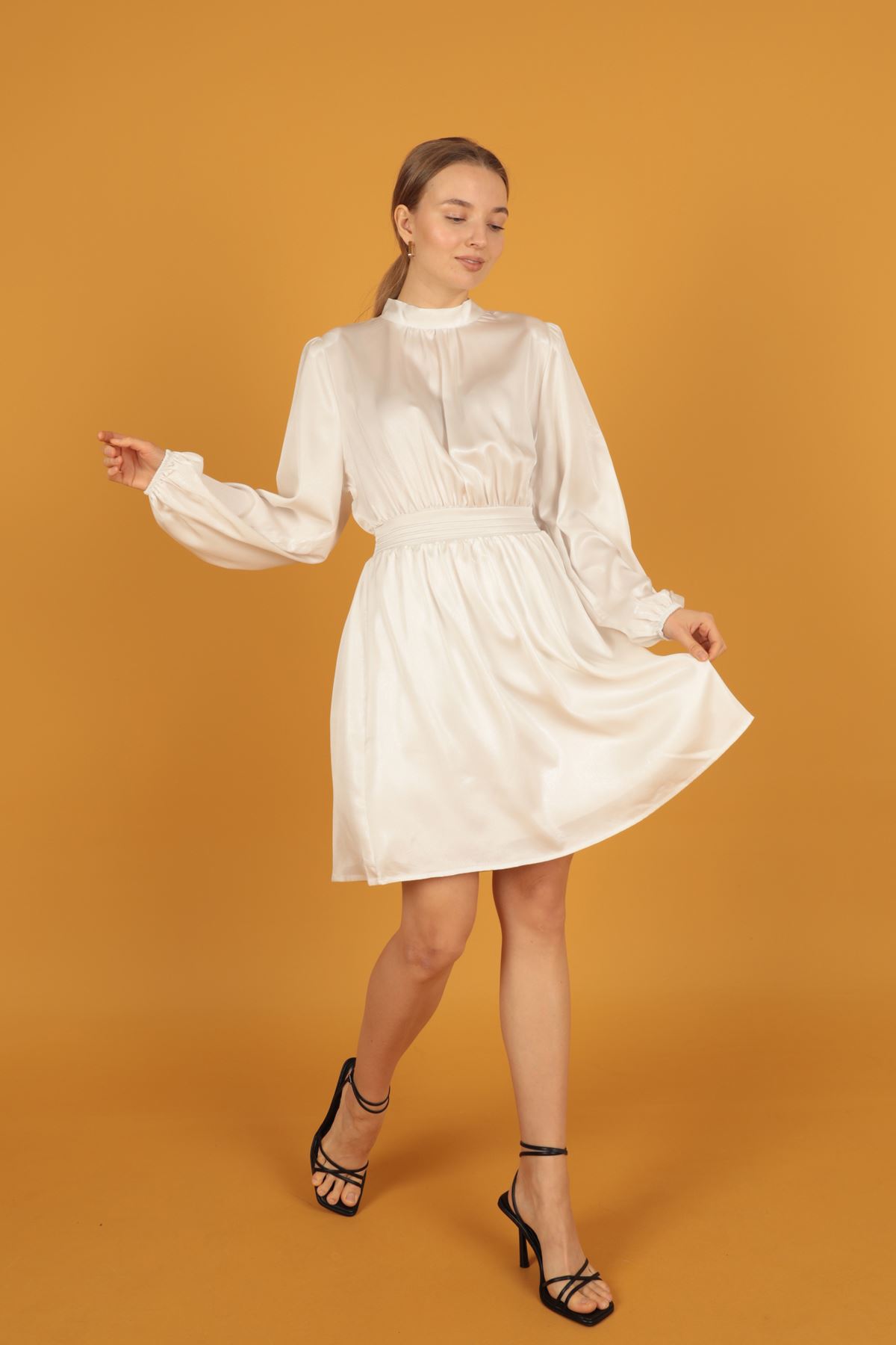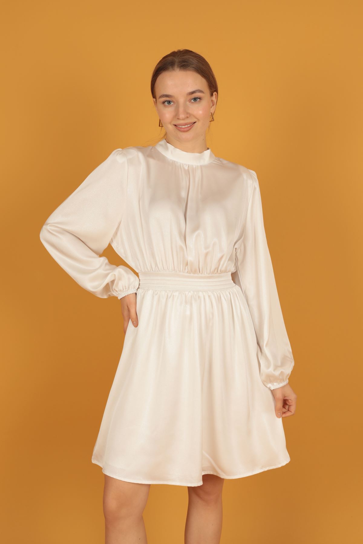 Simli Saten Büzgü Detay Elbise-Beyaz