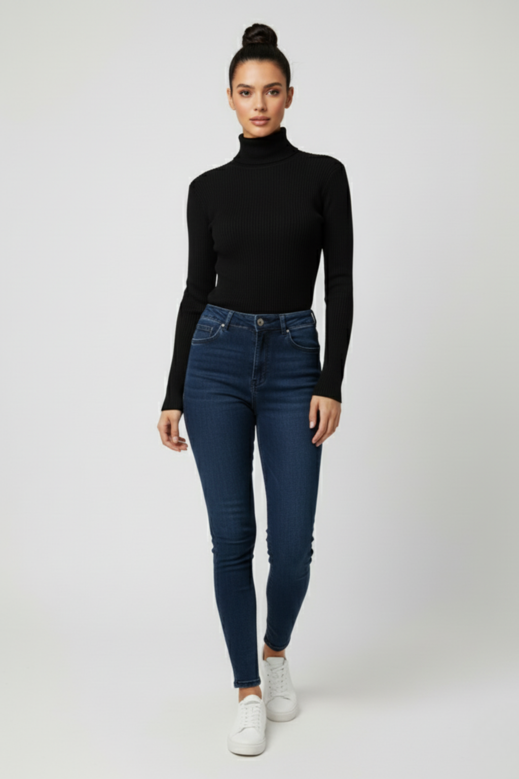 Kadın siyah boğazlı triko kazak, klasik ve her kombine uyumlu tasarımıyla stilinizi tamamlar. İnce dokusu ile konforlu kullanım sağlar.