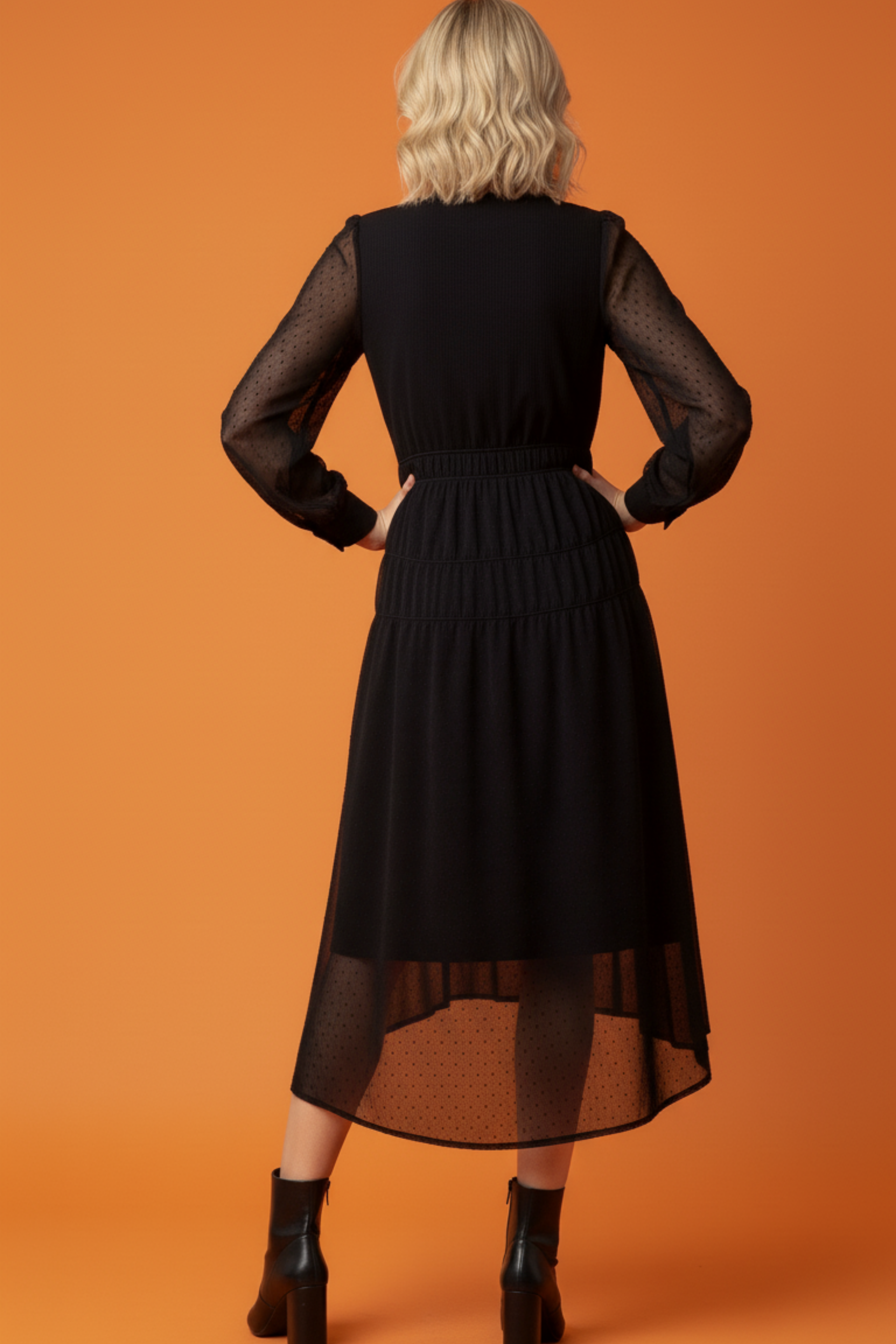 Zarif ve modern detaylarıyla dikkat çeken Siyah Tül Detaylı Büzgülü V Yaka Midi Elbise, her stile uyum sağlayan şık bir parçadır. Transparan tül uzun kolları ve bele oturan büzgülü formu, vücut hatlarını zarifçe vurgularken feminen bir siluet oluşturur. Etek ucundaki ince tül katman, elbiseye hafif ve romantik bir hareket kazandırır. İç kısmındaki yumuşak astar ise konforlu bir kullanım sağlar. Davetlerde, özel günlerde veya akşam şıklığında kolaylıkla tercih edebilirsiniz.