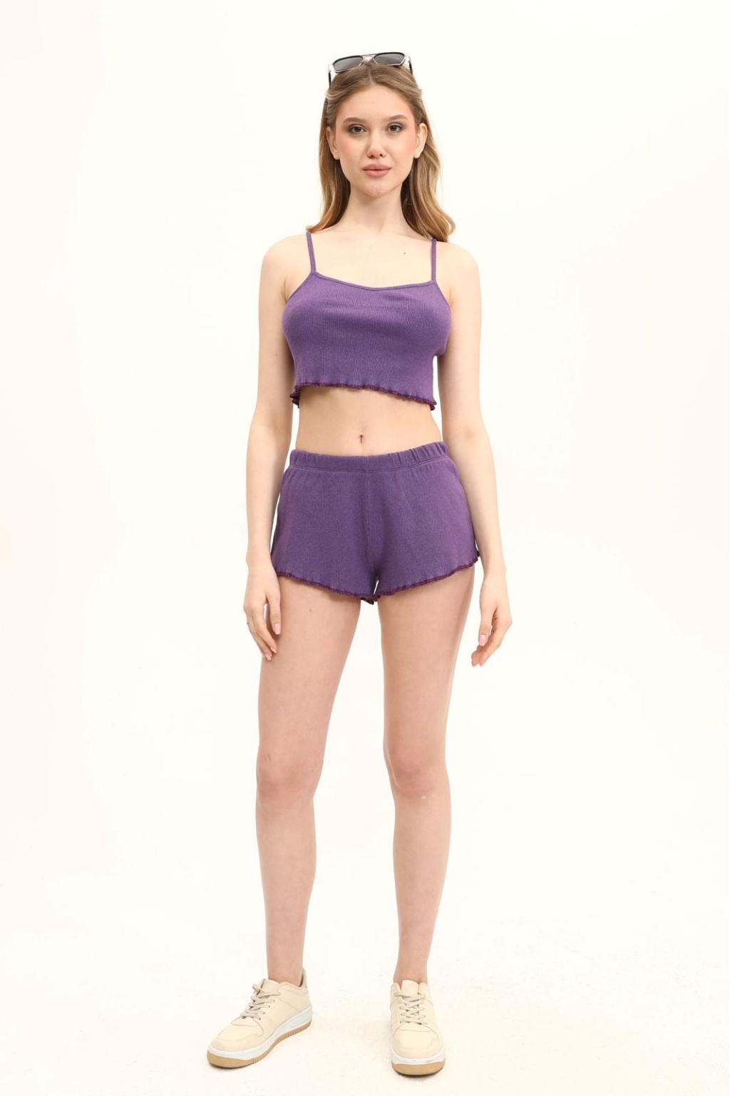 Renk trendlerinin yıldızı mor tonu ile enerjinizi yansıtan Mor Şort Crop Takım, modern, genç ve dinamik bir stilin anahtarı! Şık crop üst ve rahat kesim şort tasarımıyla hem günlük kombinlerde hem de şehir stilinde iddialı bir görünüm sunar.