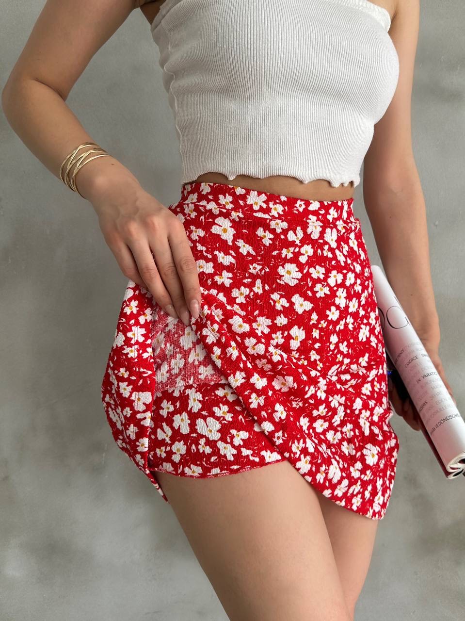 Canlı kırmızı tonu ve zarif çiçek deseniyle öne çıkan mini şort etek, enerjik ve feminen bir tarz sunar. İç kısmındaki şort detayı sayesinde gün boyu rahat hareket etme imkânı verirken, dış kısmındaki etek formu modern ve şık bir görünüm kazandırır. Vücuda hafifçe oturan yapısı ile konforlu, bir o kadar da zarif bir duruş sağlar.