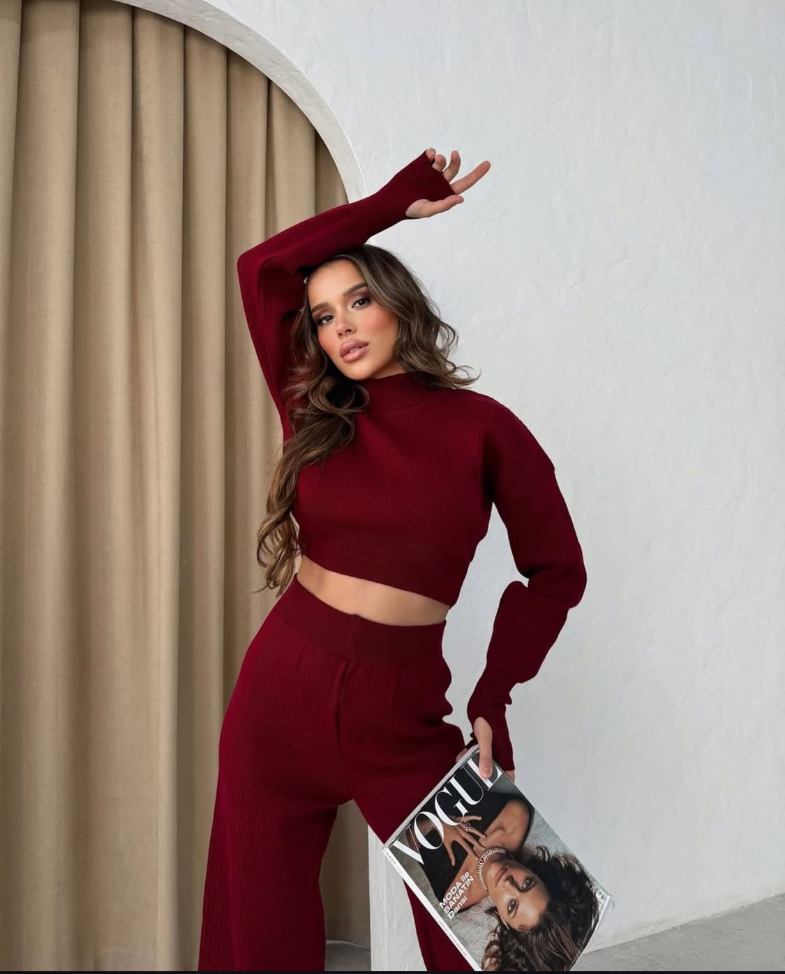 Triko Pantolon ve Parmak Geçmeli Bordo Kazak İkili Takım, bordo rengin asaletini modern ve rahat bir tasarımla buluşturuyor. Yumuşak triko kumaşı sayesinde gün boyu konfor sunarken, parmak geçmeli kazak detayı takıma sportif ve şık bir dokunuş katıyor. Esnek yapılı triko pantolon, zarif bir siluet oluşturur ve hareket özgürlüğü sağlar. Hem günlük kullanımda hem de şehir şıklığında stilinizi öne çıkaracak bu ikili takım, sezonun en göz alıcı kombinlerinden biri!