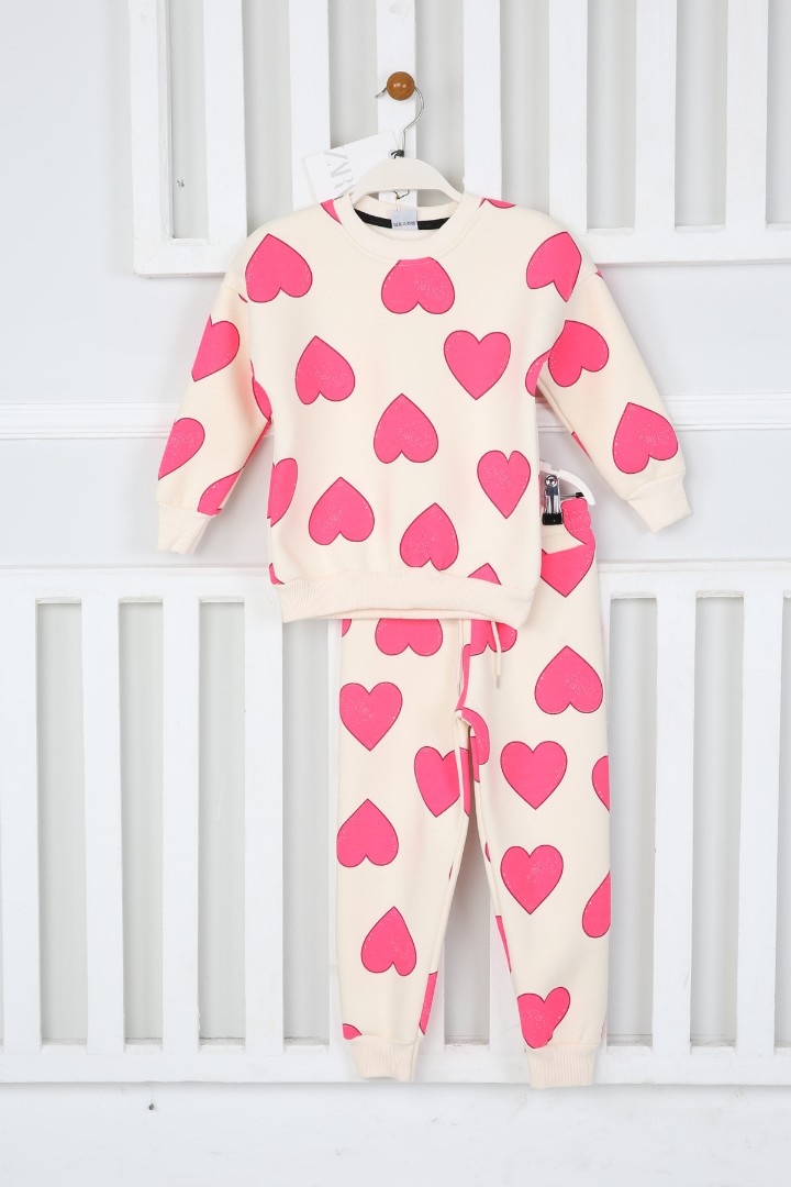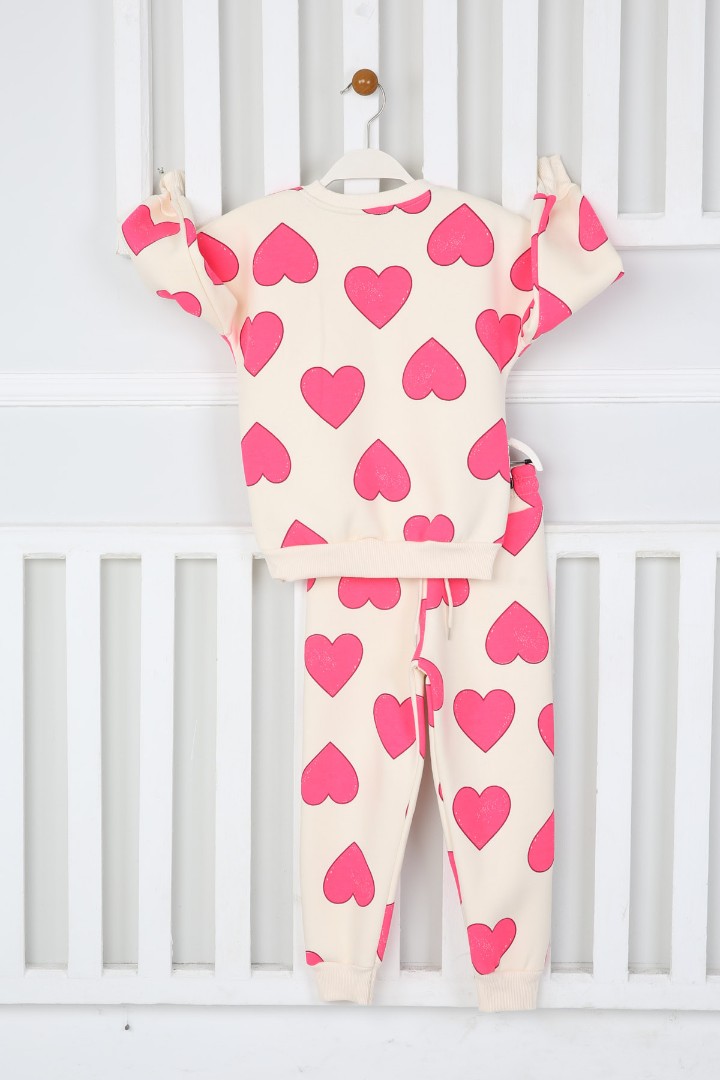 Üç İplik Şardonlu Kalp Baskılı Kız Çocuk Günlük Takım
