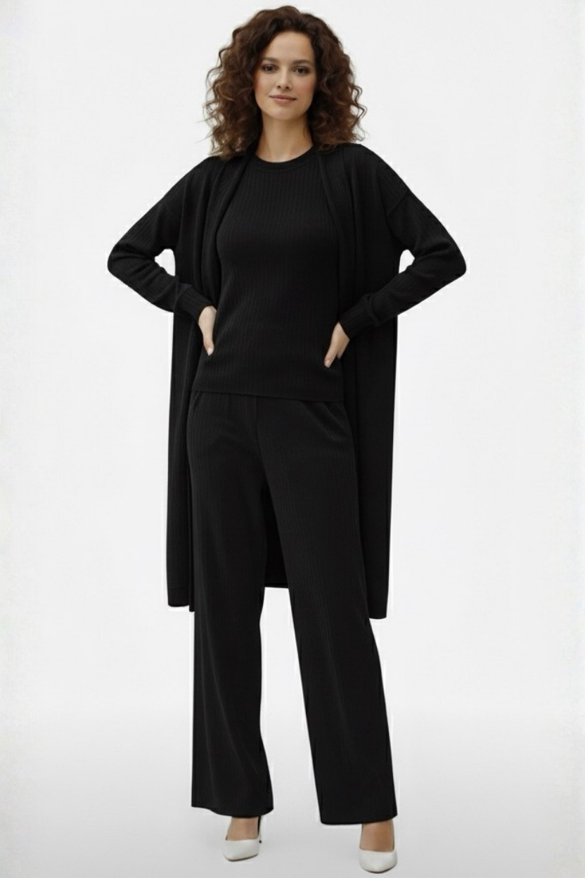 Kadın Gri Ribanalı Üçlü Takım Uzun Hırka Bisiklet Yaka Bluz Lastikli Boru Paça Pantolon