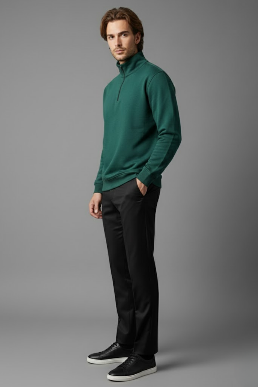 Bu Unisex Yarım Fermuarlı Sweatshirt, hava geçişleri ve kışlık kombinler için ideal olan 2 İplik kumaş yapısıyla üretilmiştir. Koyu ve şık Koyu Yeşil rengi, dik yaka tasarımı ve Basic yapısıyla stilinizi tamamlar.