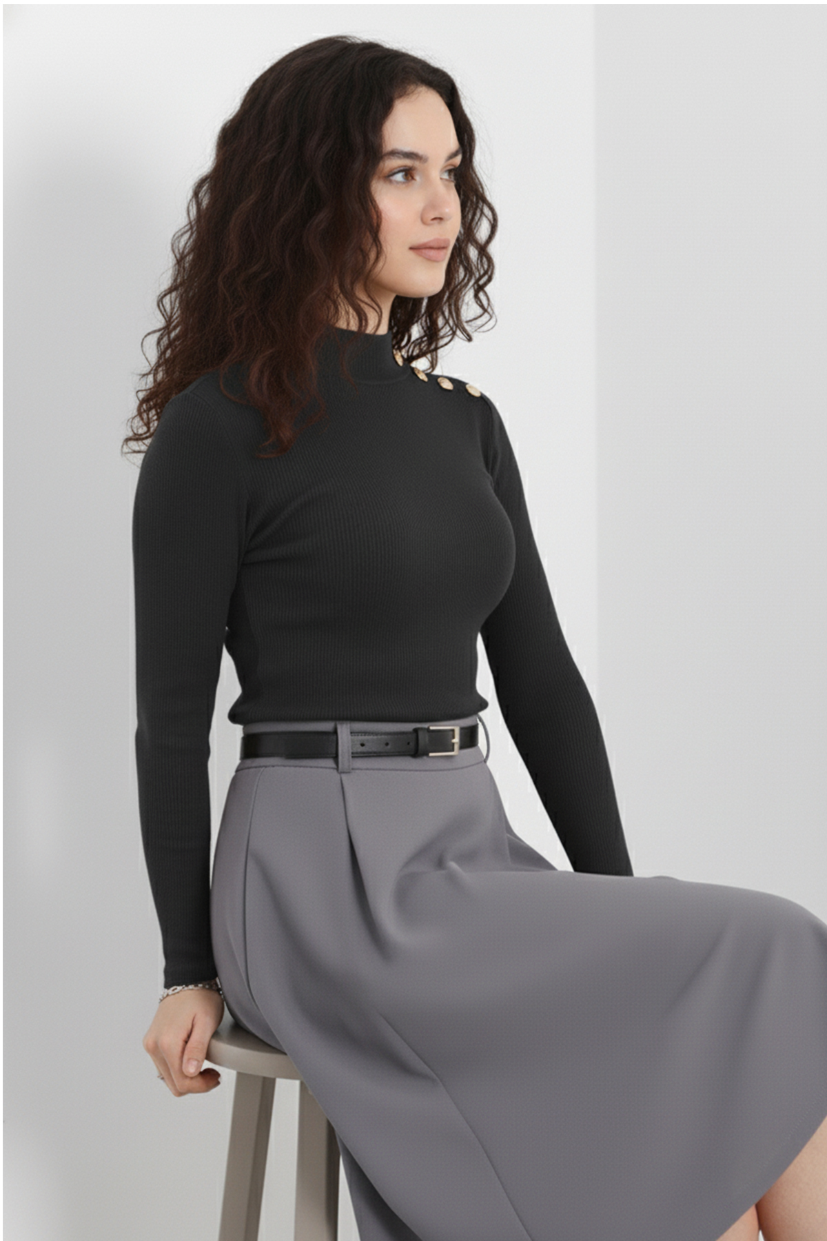 Gold renkli düğme detayları bluzun şıklığını tamamlar; balıkçı yaka formu ise modern ve sofistike bir görünüm kazandırır. Mevsim geçişlerinde veya tüm sezonlarda konforla tercih edilebilir.