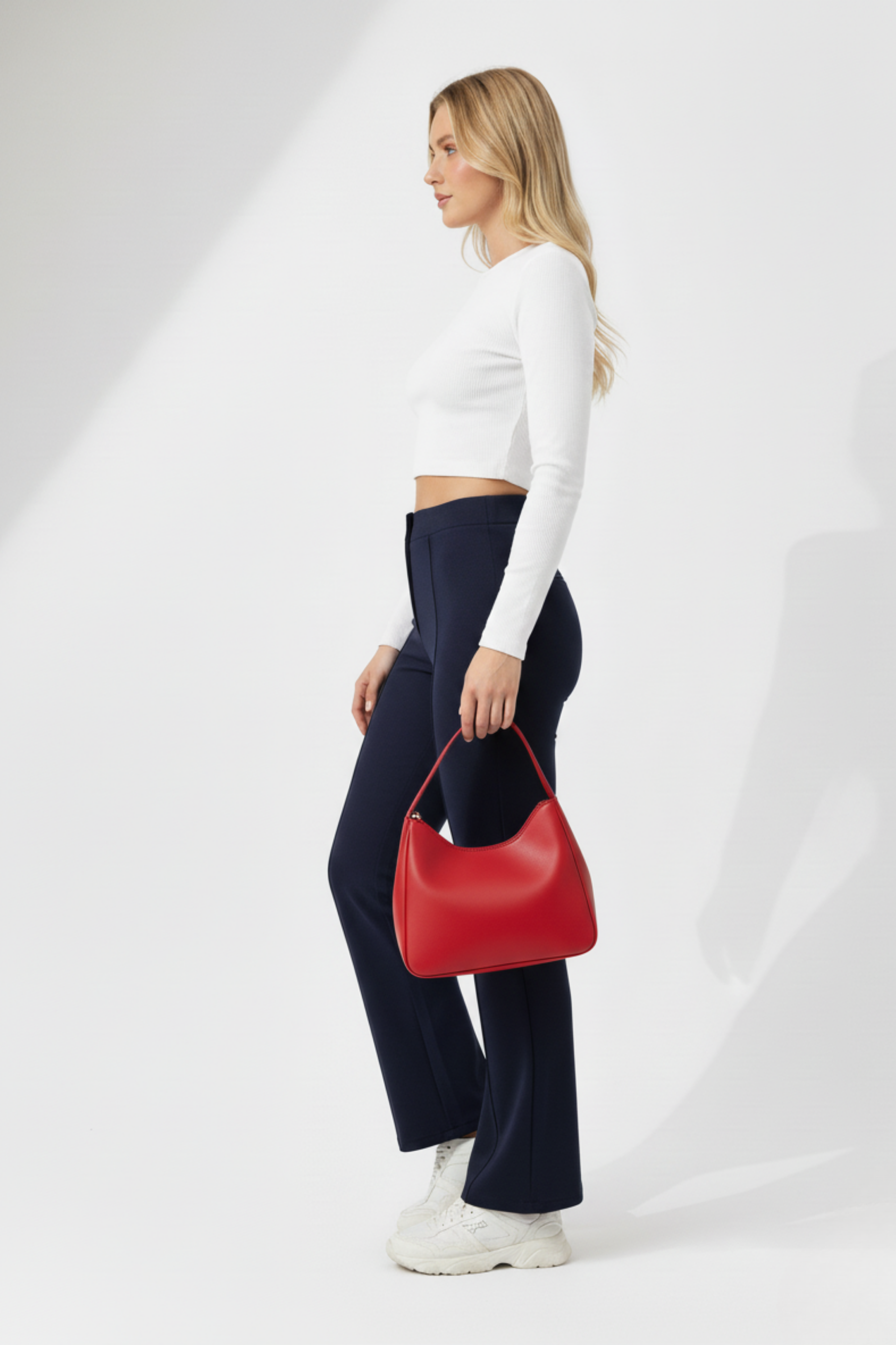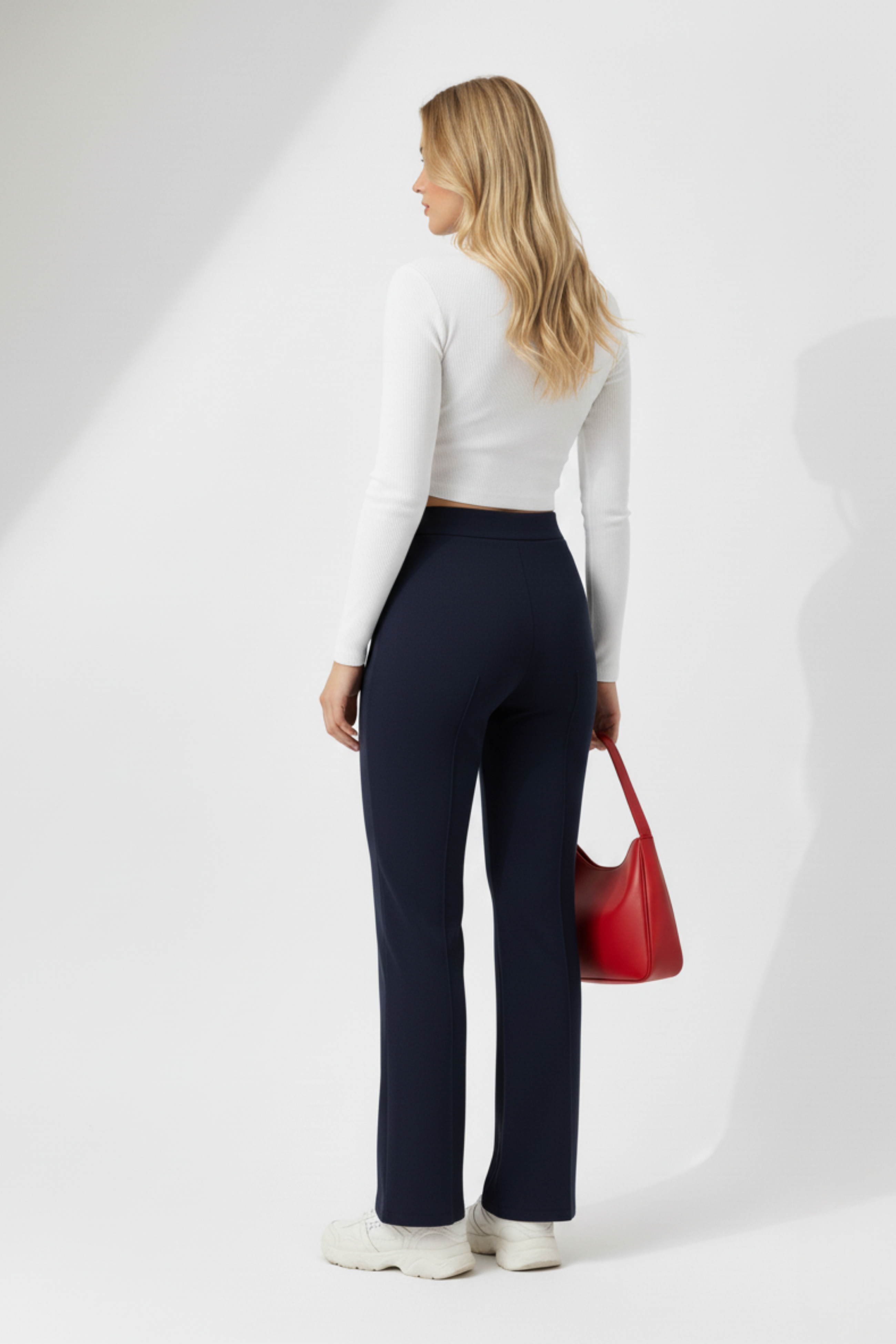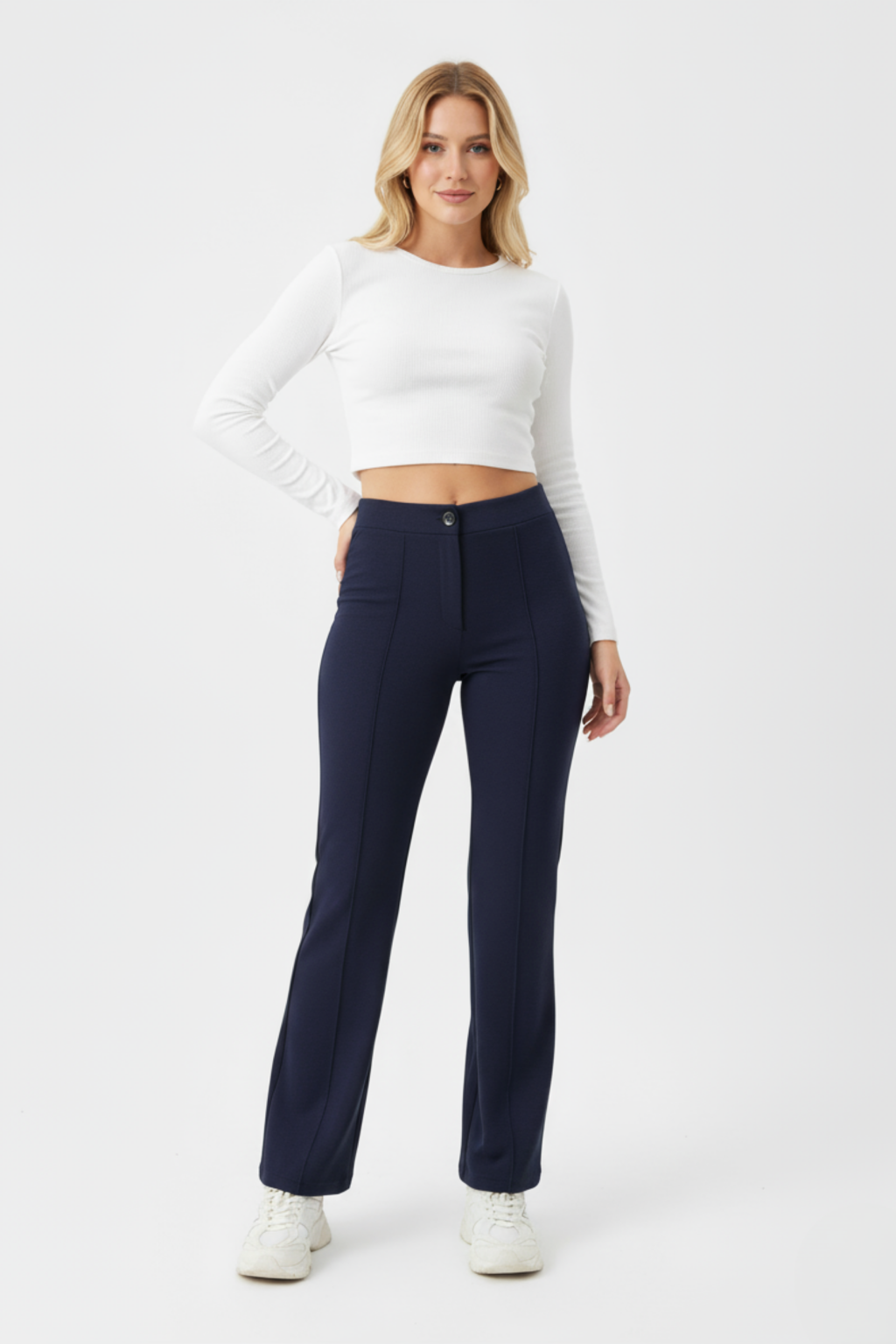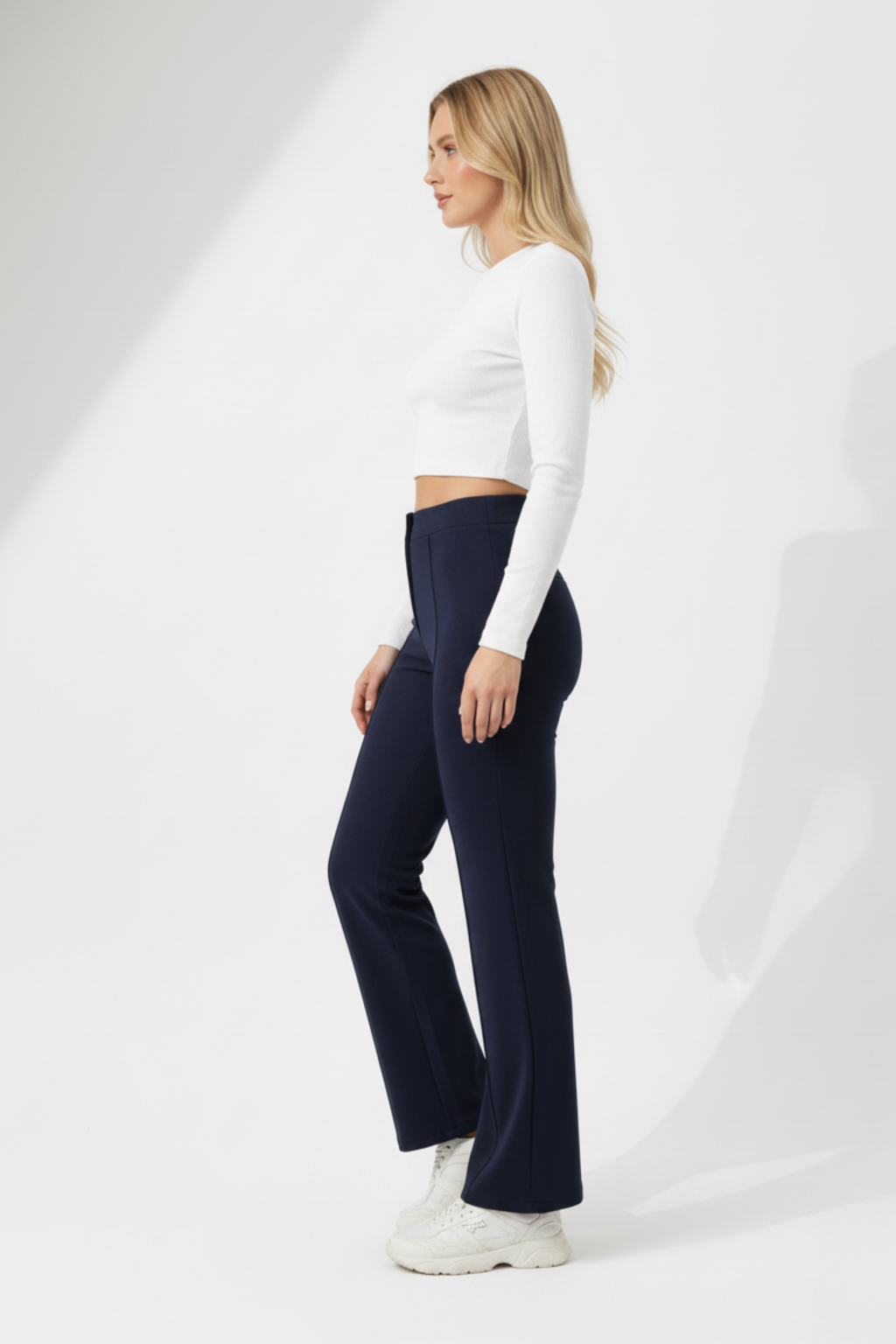 Yüksek bel tasarımı, bel bölgesini destekleyerek gün boyu konfor sağlar. Ön kısımdaki çıma detayı pantolona düzenli ve sofistike bir görünüm kazandırır. İspanyol paça kesimi ve palazzo kalıbı bacak boyunu uzun gösterir, kadın stiline zarif bir dokunuş ekler.